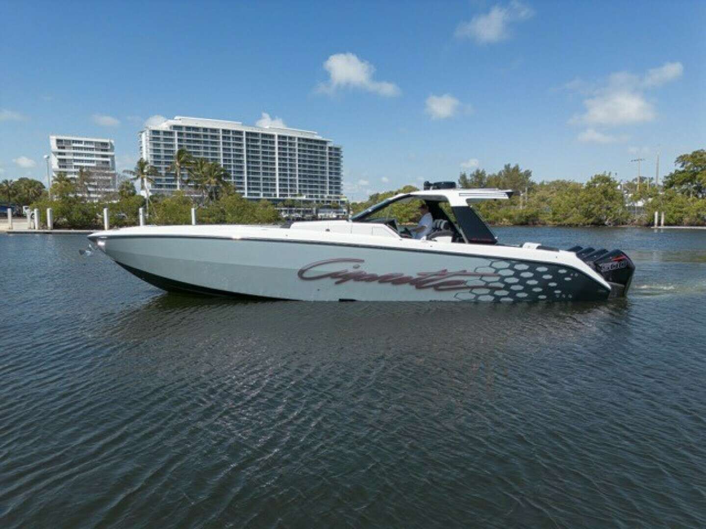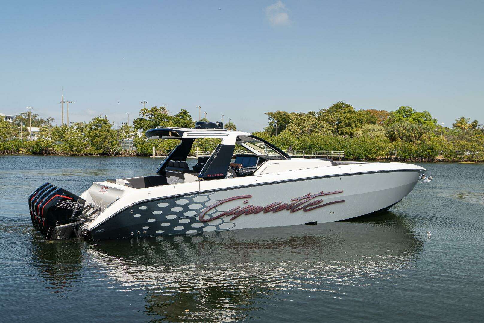 The 2025 Cigarette 42 Auroris is the ultimate expression of luxury performance and offshore capability, powered by quad Mercury Racing 500Rs and crafted with Cigarette’s legendary attention to detail. Her striking two-tone gel coat with custom paint, white hardtop with flair wings, and stainless steel rub rail make a bold statement on the water, while telescoping aft sunshade and sea deck flooring add practicality and comfort.