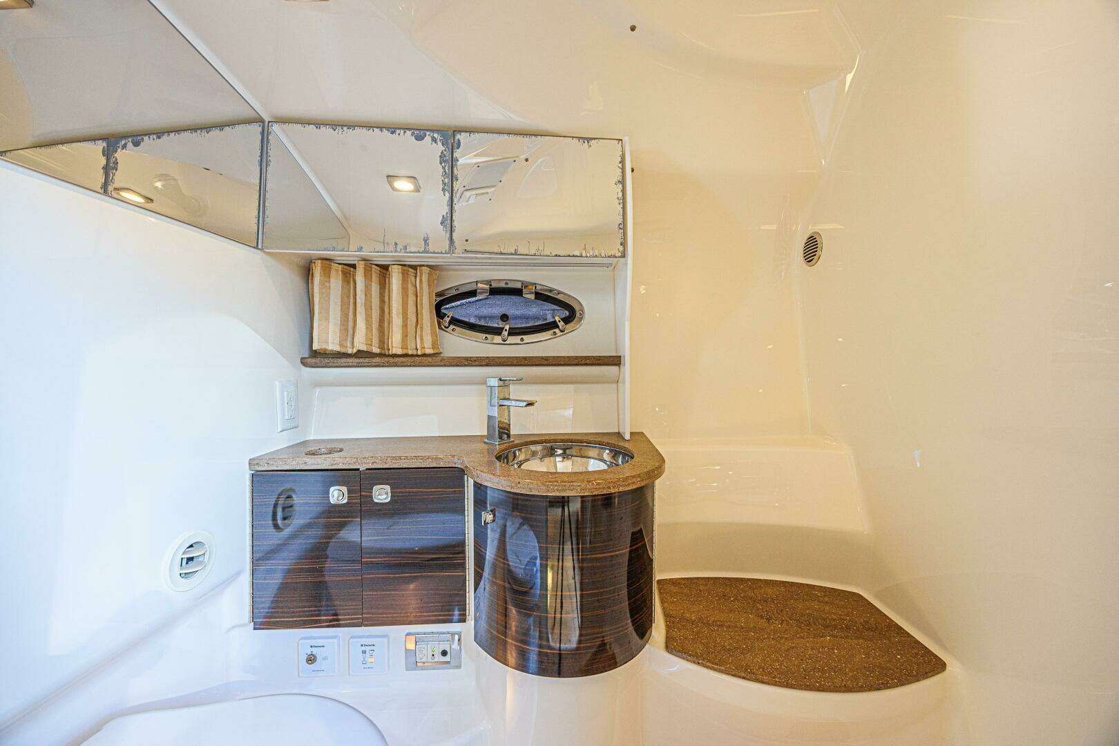 - Molded fiberglass private head compartment w/Corian vanity, lower doors in high-gloss Deep Cherry finish, polished stainless steel sink w/faucet, porcelain Flush and Forget® VacuFlush® head unit w/50-gallon holding tank & dockside pumpout, separate shower area w/Corian seat, exhaust fan & nightlight