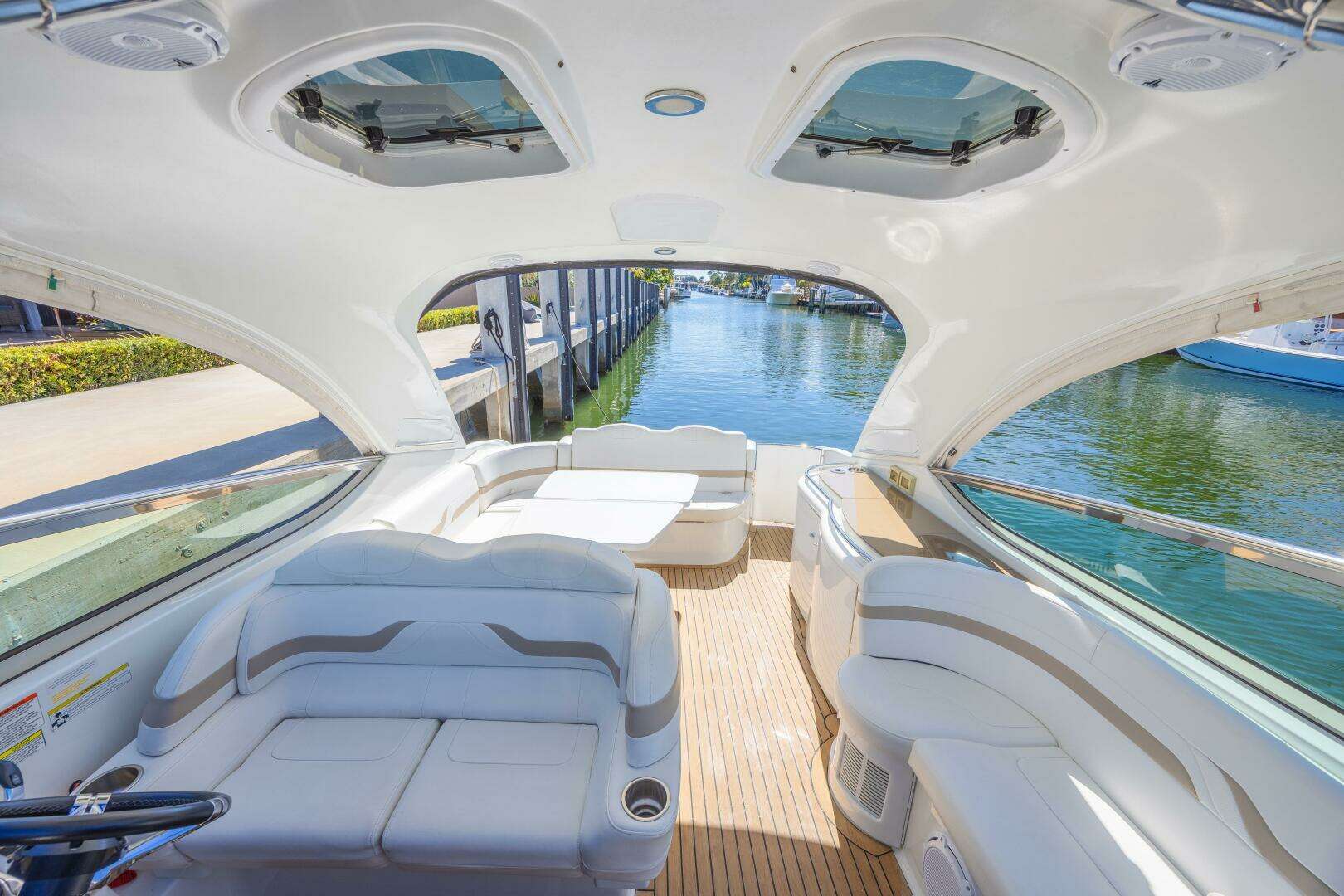 - Two arch mounted & four cockpit 150W 6 1/2" marine-grade speakers w/polished stainless steel grilles & separate tweeters, 600W amplification & 200W subwoofer