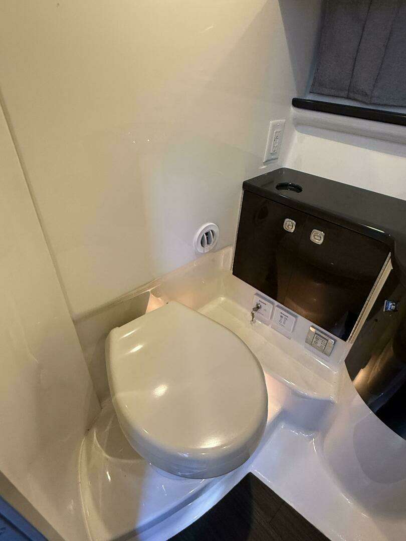 - Private head w/ Corian countertop, SS sink, VacuFlush® toilet, 50-gal holding tank, dockside pump out, separate shower w/ molded seat & exhaust fan