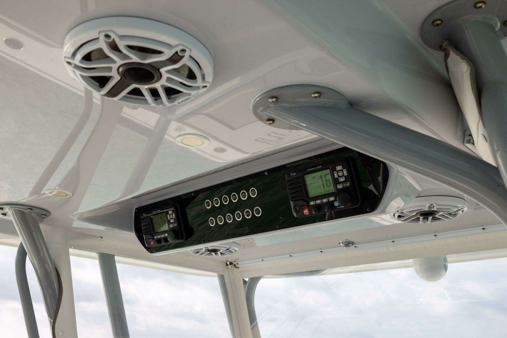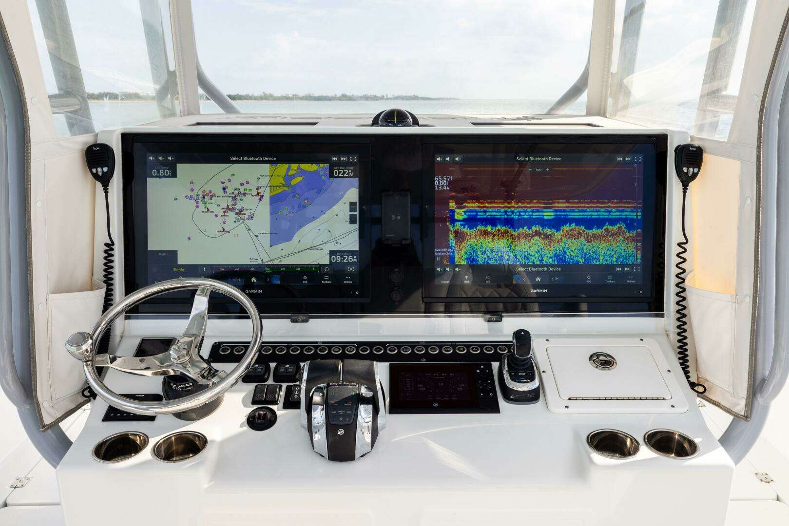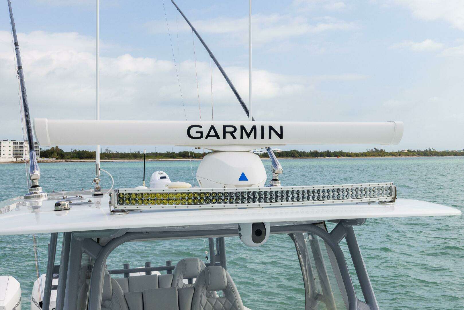 At the helm are twin Garmin 8624 displays supported by a full Garmin electronics suite, including open-array radar, dual Airmar transducers, FLIR night vision, and a powerful 50” Rigid light bar for confident navigation day or night. Fishing capability is enhanced with Gemlux Bluewater outrigger bases, 21’ Marsh Tacky carbon fiber outriggers, teak rocket launcher, multiple electric reel outlets, and dual in-floor livewells.
