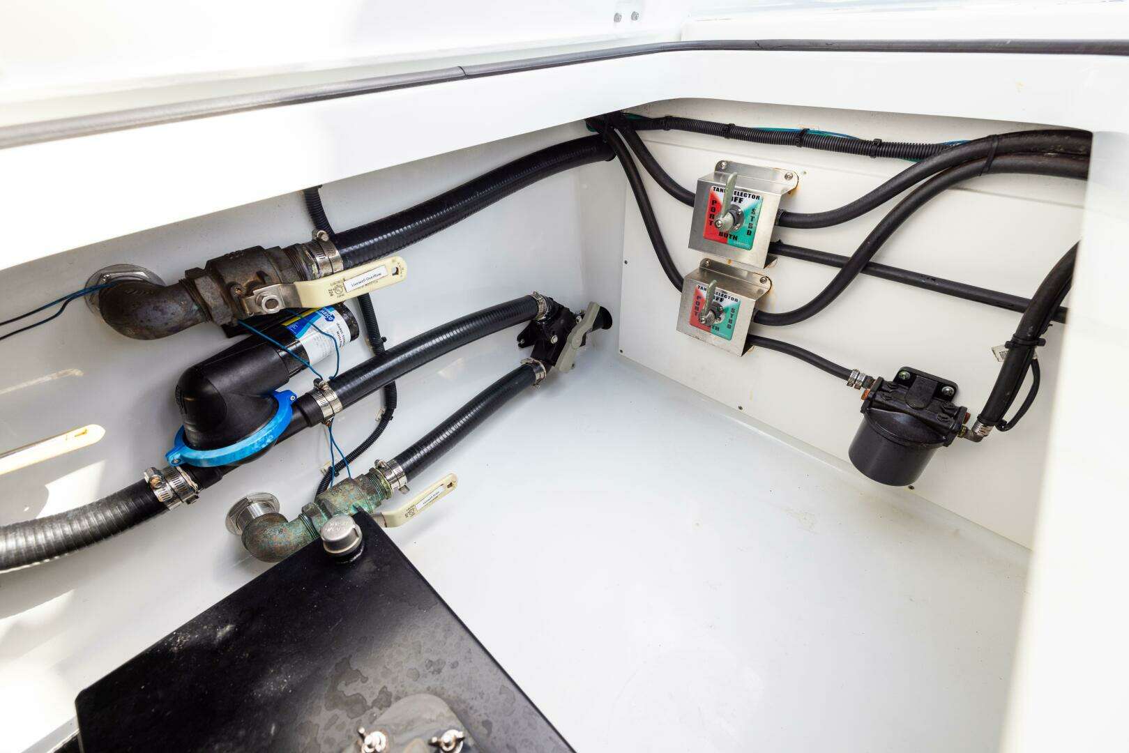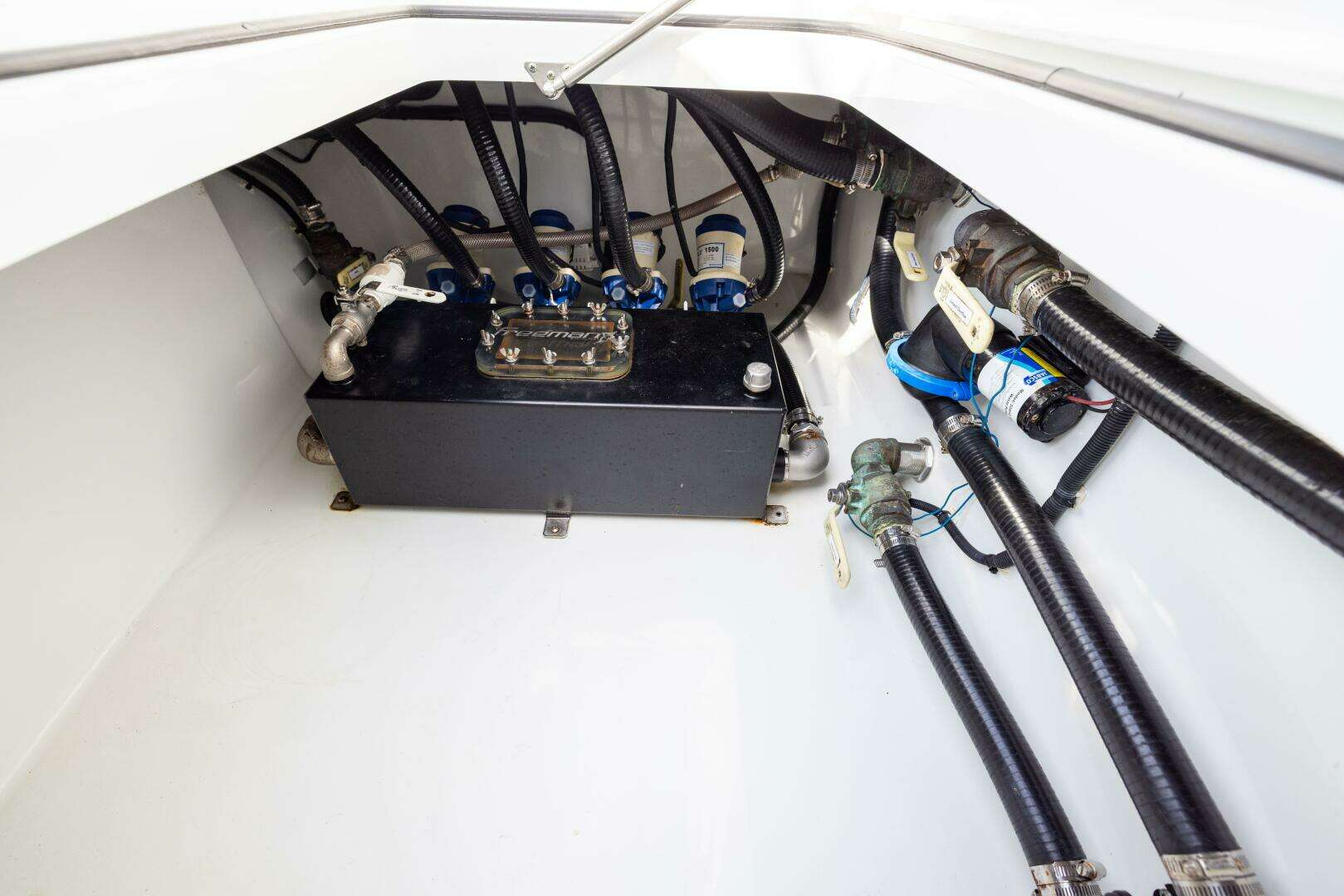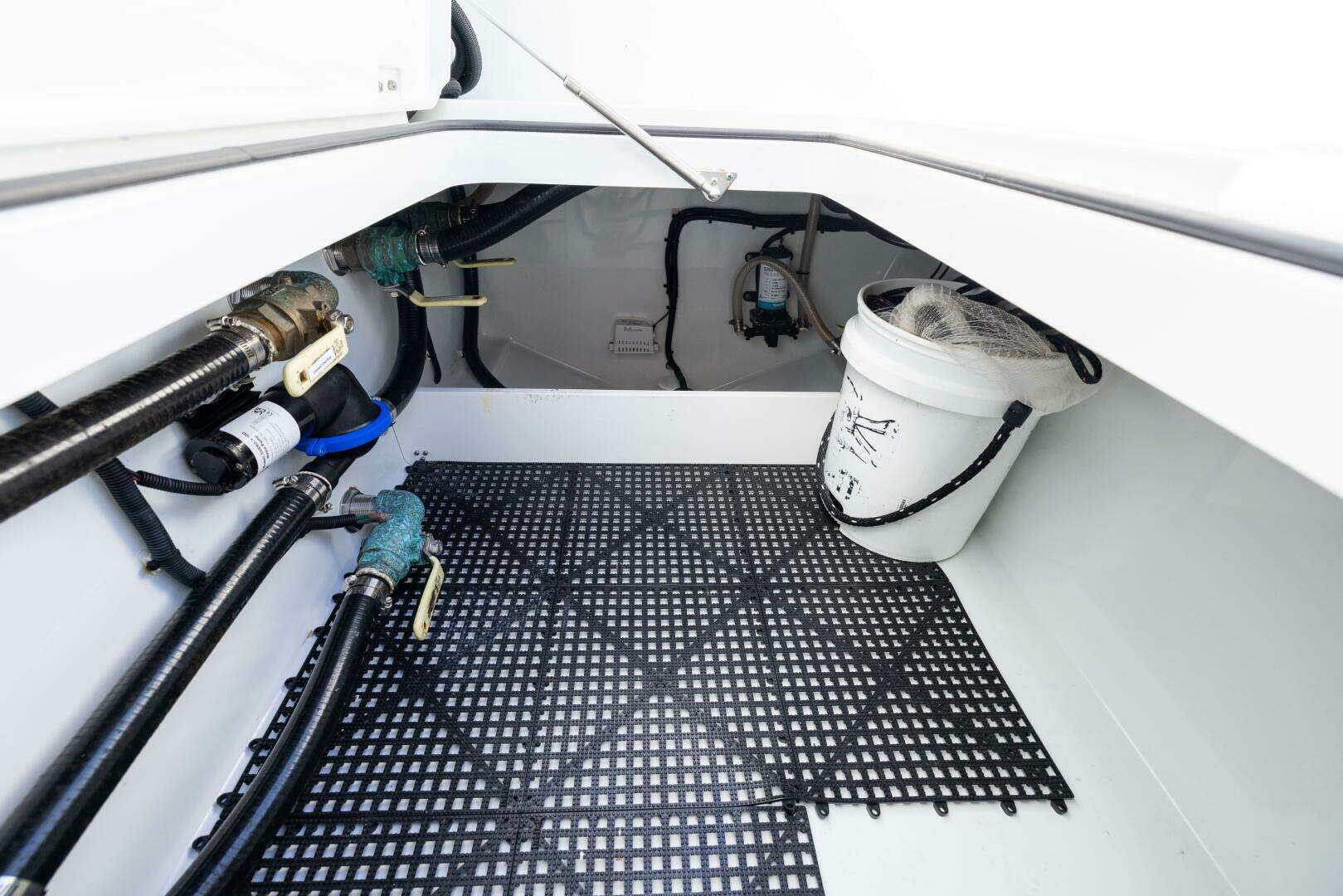 At the helm are twin Garmin 8624 displays supported by a full Garmin electronics suite, including open-array radar, dual Airmar transducers, FLIR night vision, and a powerful 50” Rigid light bar for confident navigation day or night. Fishing capability is enhanced with Gemlux Bluewater outrigger bases, 21’ Marsh Tacky carbon fiber outriggers, teak rocket launcher, multiple electric reel outlets, and dual in-floor livewells.