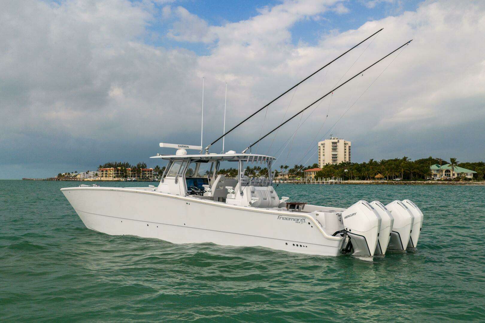 2022 Freeman 42LR “Turks Islands” in Whisper Gray powered by quad Mercury V8 300s (967 hrs) with Optimus joystick. Equipped with full Garmin electronics, FLIR, Marsh Tacky outriggers, JL Audio, and Lebroc seating—built for serious offshore fishing with premium comfort.