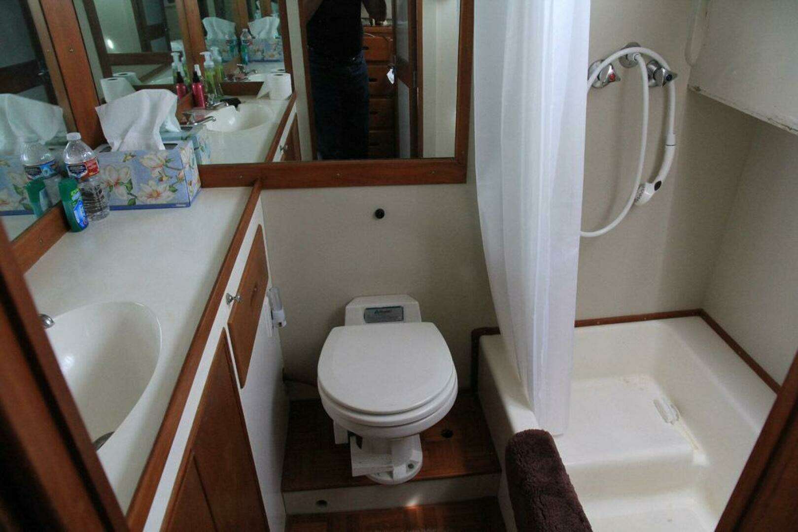 There are twin access doors to the main saloon. Full view with new Diamond SeaGlaze tinted wraparound windows provide excellent visibility. New Closed Cell draw down blinds provide privacy. The settee can sit 6 people with a custom foldable table for easy access. Twin refrigerators provide plenty of storage for many days at anchor. The helm is to Starboard and has full electronics at easy reach. Forward and down 2 steps is the guest cabin and full head. Aft is the master cabin with twin beds and full head including a separate shower/tub.