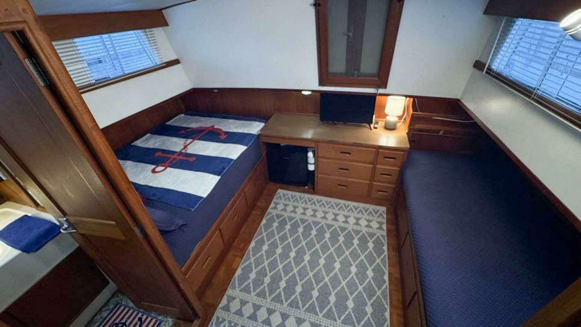 - Easy access to both side decks via teak doors port and starboard