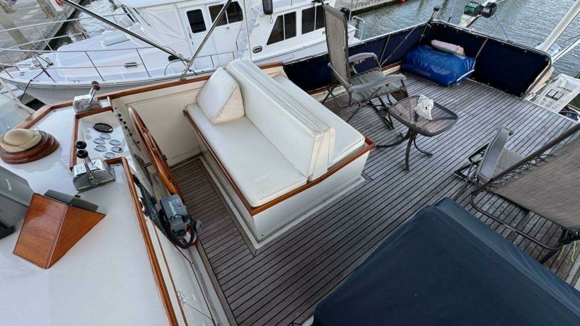 Topside, the flybridge offers excellent visibility with comfortable seating, updated cushions, and full controls for easy handling. A hinged mast allows reduced clearance (12’ Bimini down / 16’ Bimini up / 23’ with mast up) for Loop-friendly cruising.