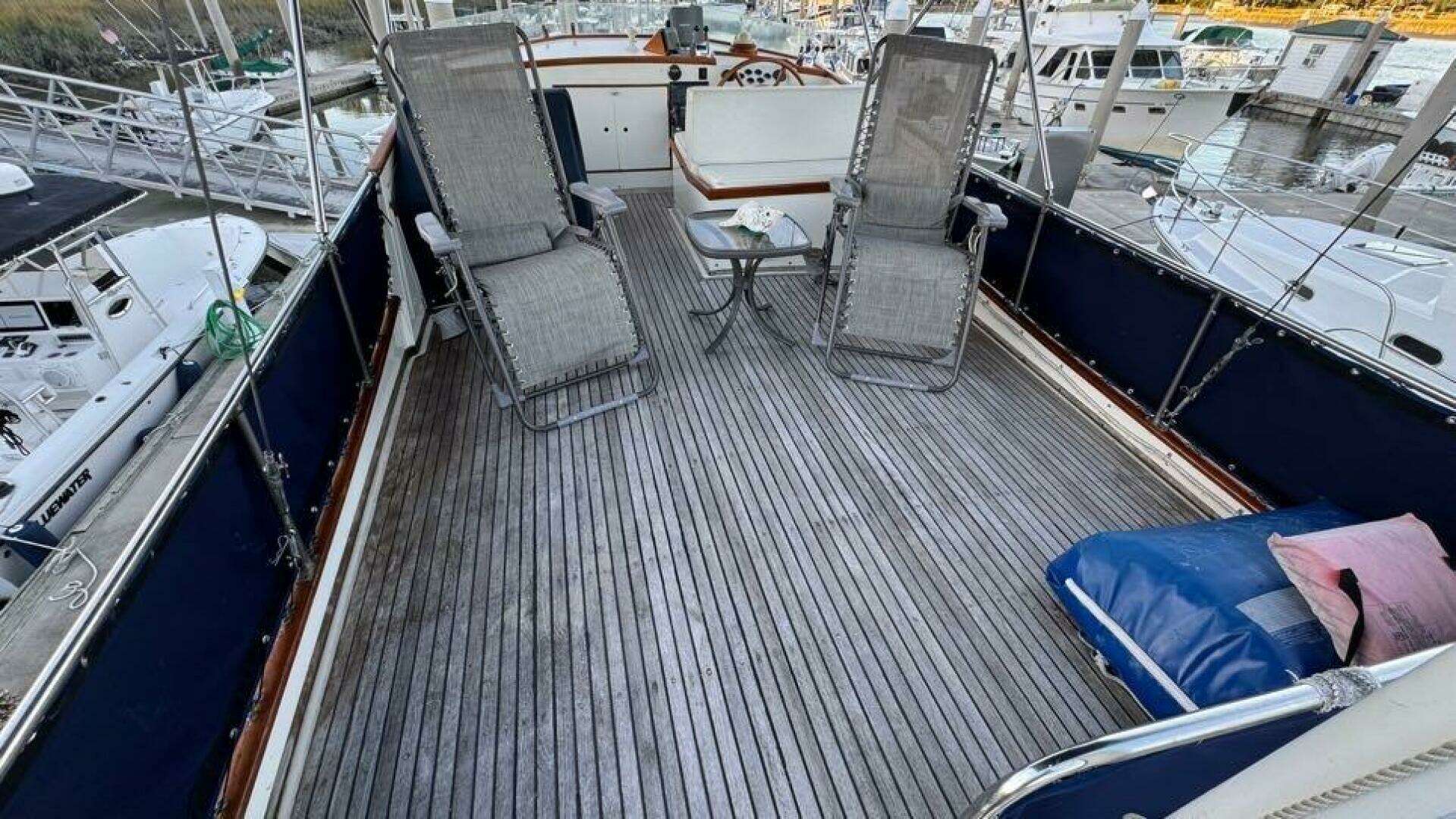 - Wide walk-around side decks with sturdy teak caprails