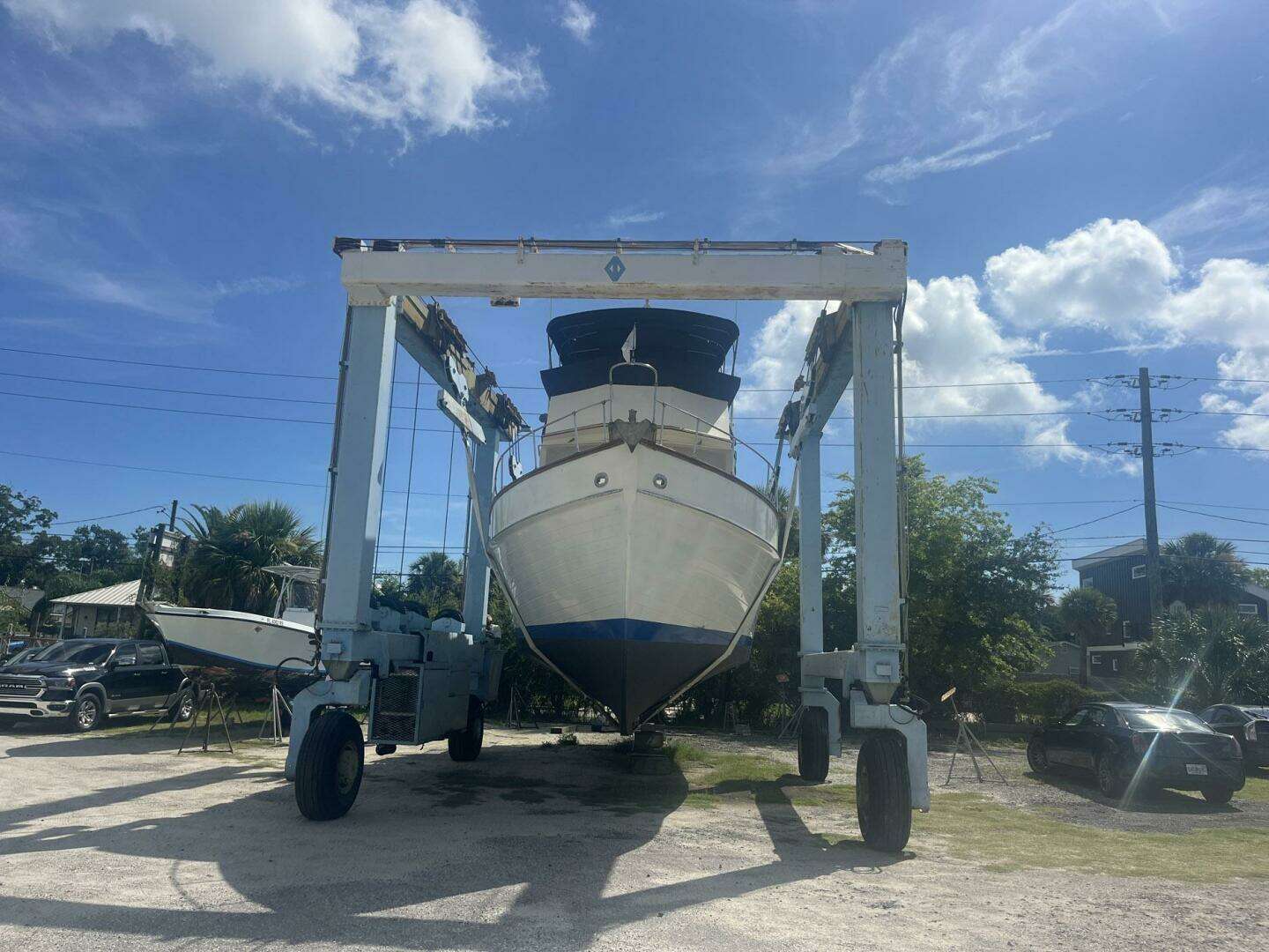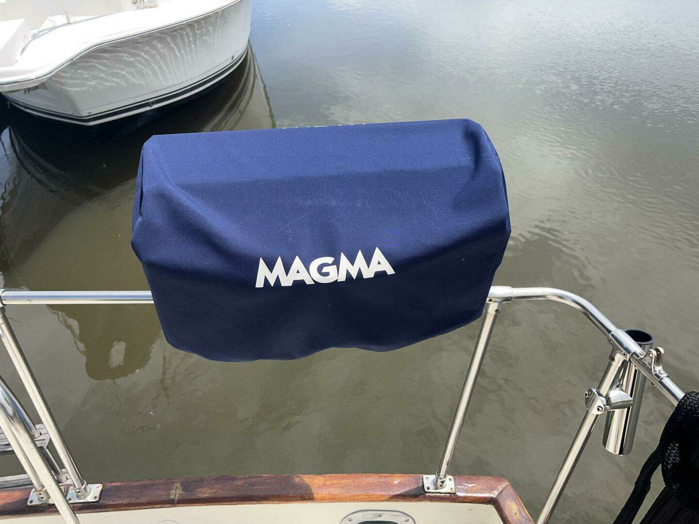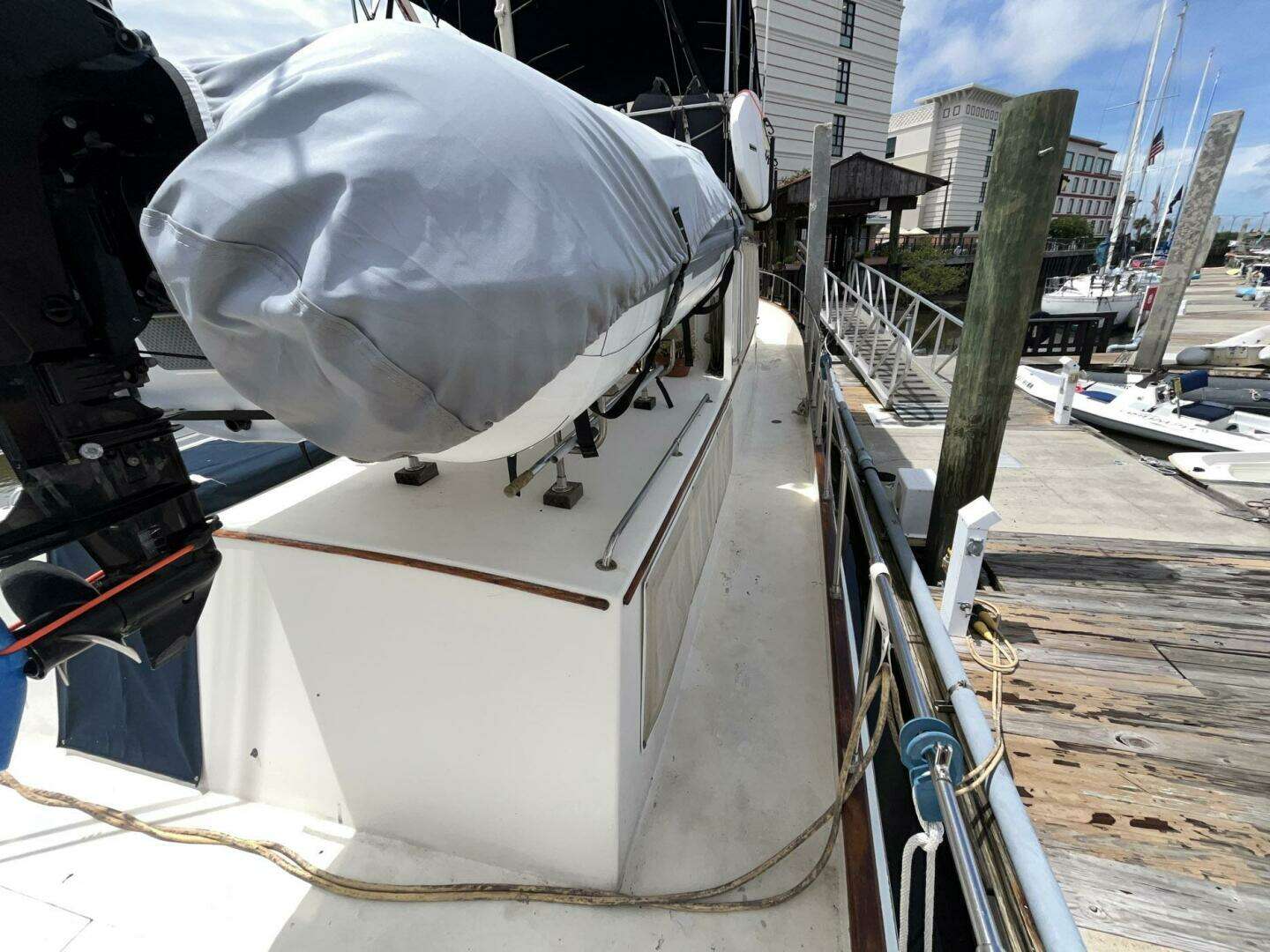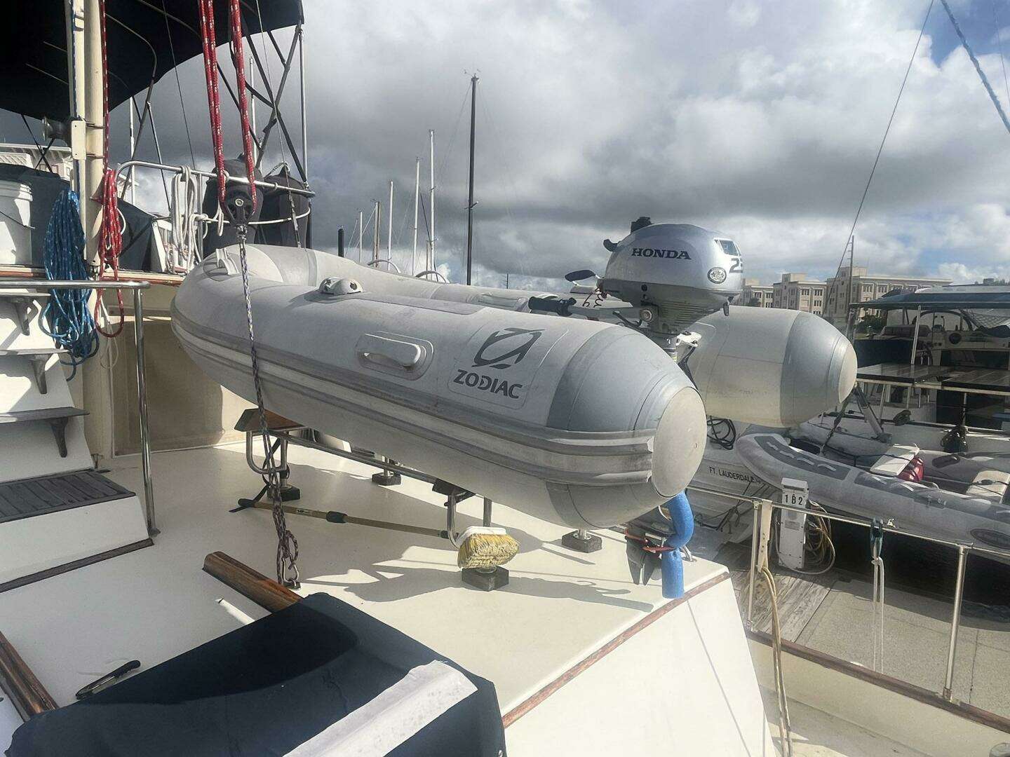 The tender is stored on the trunk deck. The mast/tender davit with winch was rebuilt in 2025. The block and tackle were replaced at the same time. The trunk deck also has a hatch with a dark blue Sunbrella cover, which allows access to the master stateroom. There is a storage lazarette in the deck aft. A covered Magma grill is mounted on the aft rail.