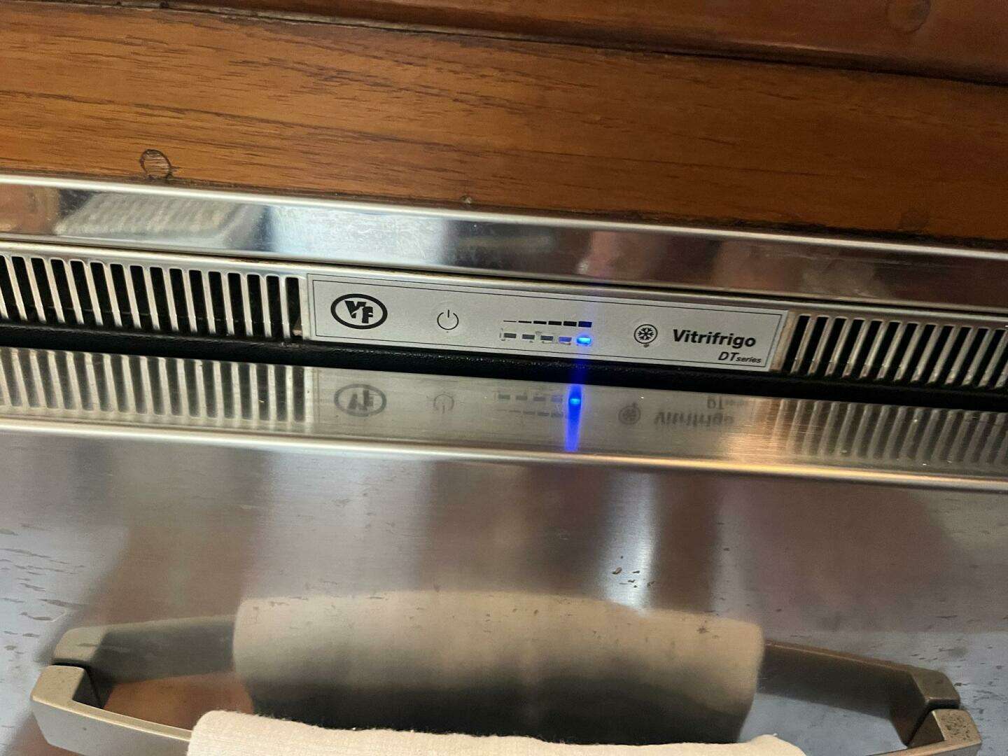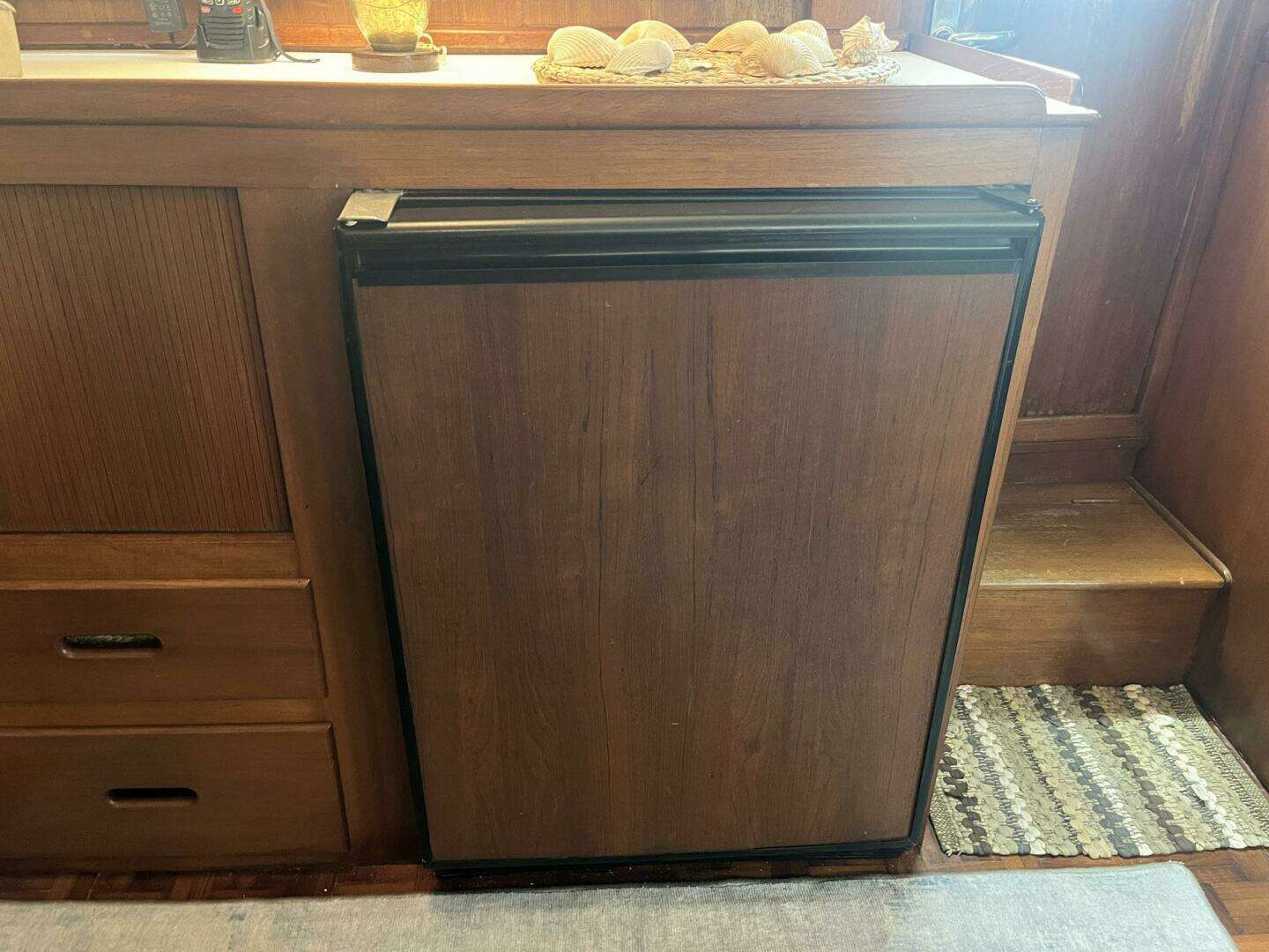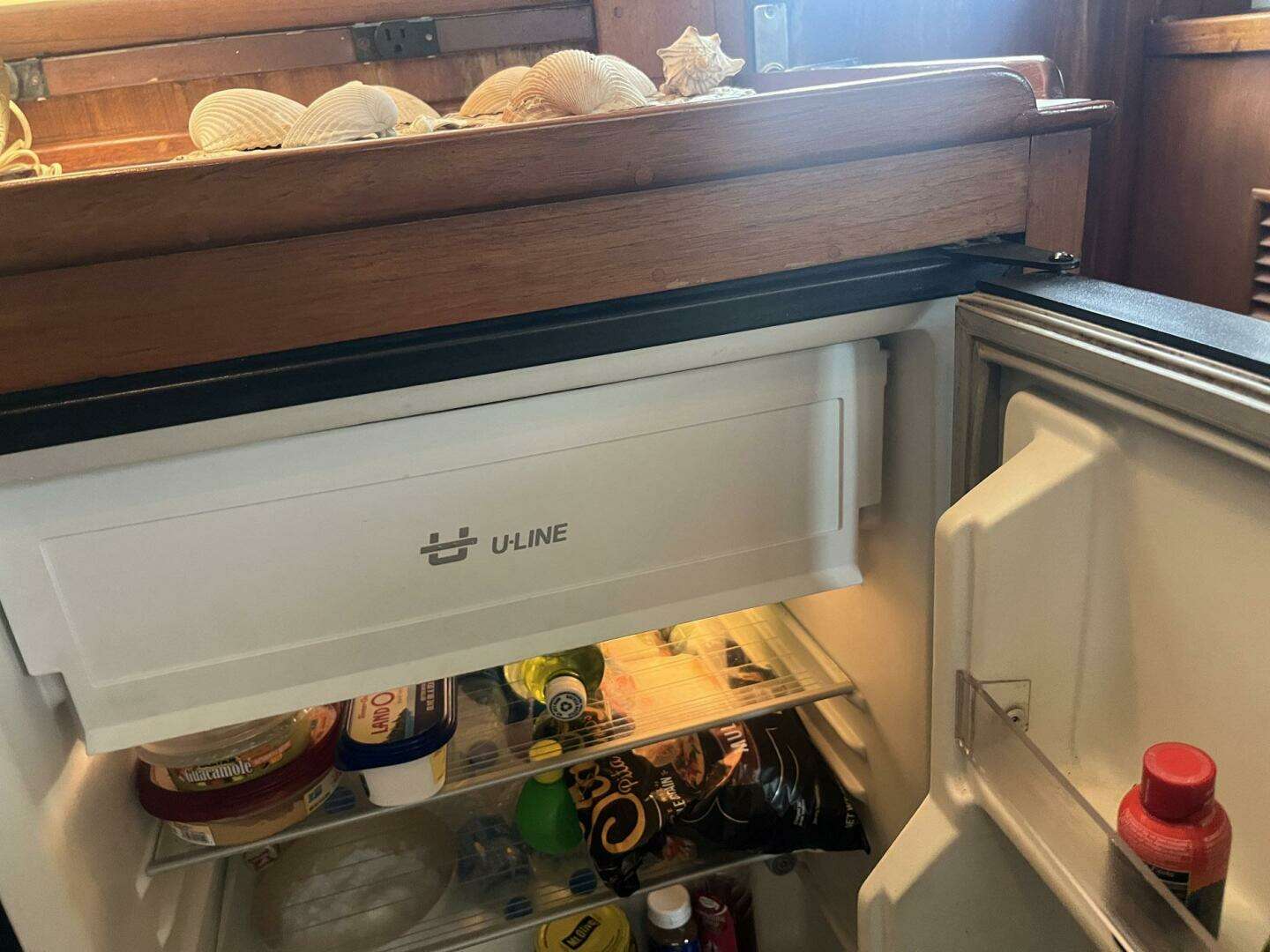 Across from the settee, to port, is a large storage area. There is a full-length strip of electrical outlets, which is handy for the many electronic devices in use today. The counter would make an ideal space for a television, if the new owner wants to add one. A counter-height U-Line refrigerator with a small freezer compartment is located forward in the storage area.