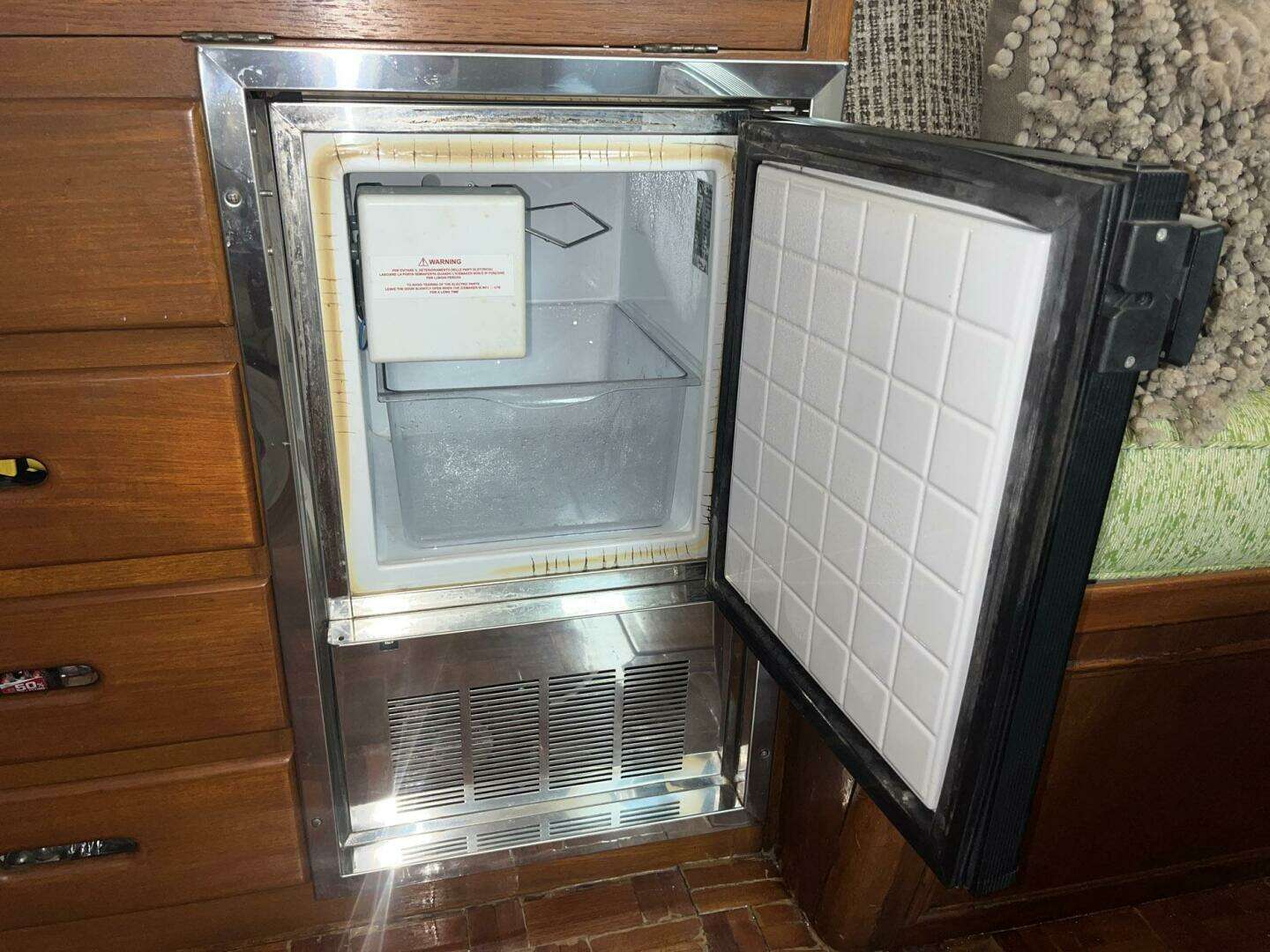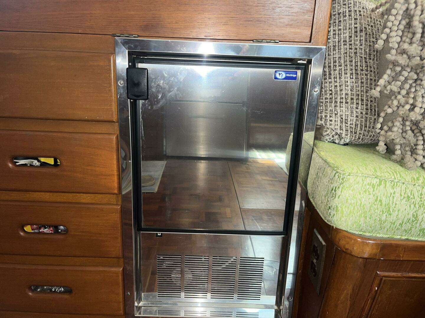 Directly aft of the helm station, to starboard, is the liquor cabinet and ice maker. The liquor cabinet top opens to reveal bottle and glass storage. The cabinet front opens to provide a handy ledge for mixing beverages. A Vitrifrigo ice maker (2020) is below the liquor cabinet, as well as several storage drawers.
