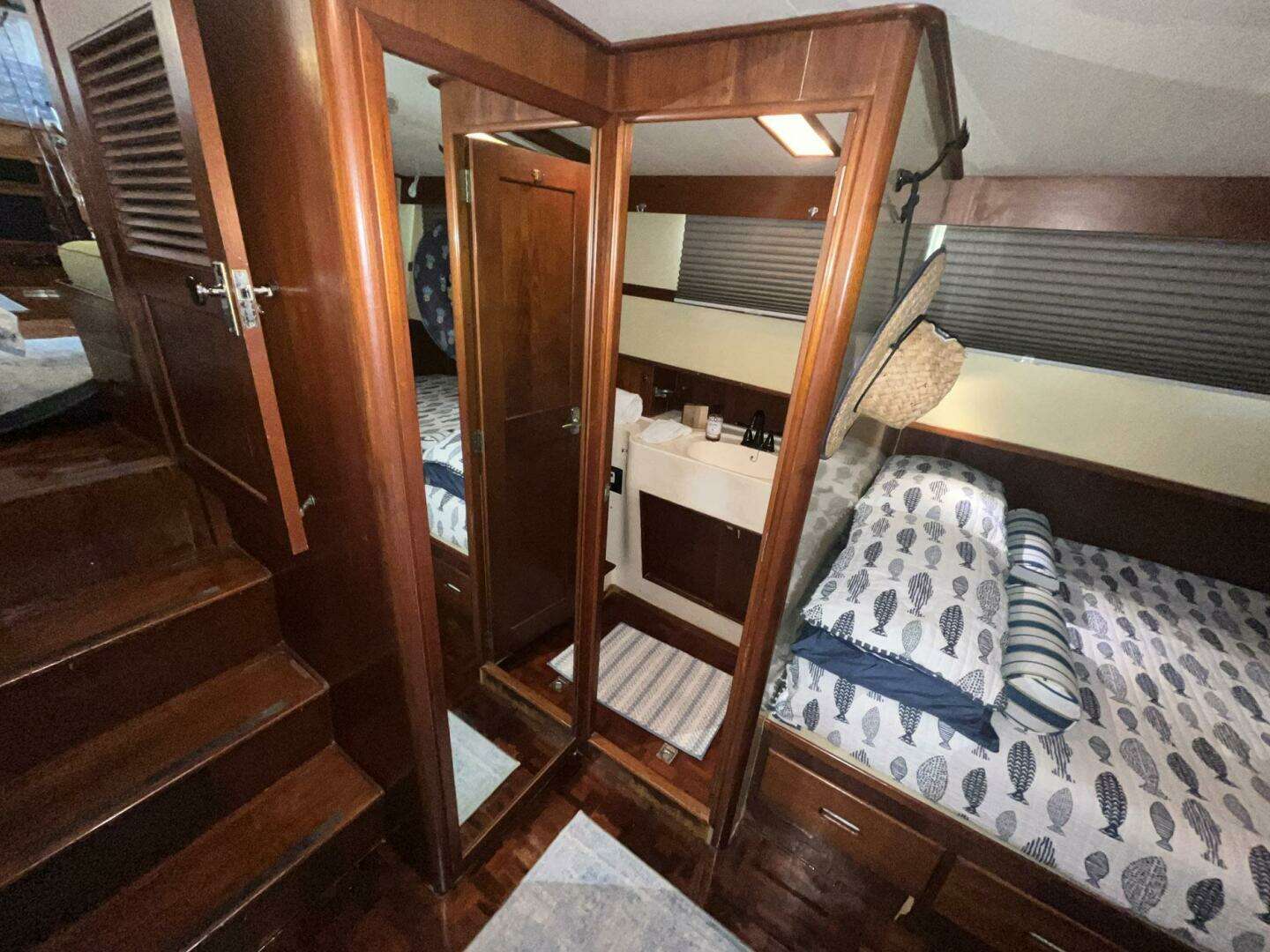 There are room-darkening honeycomb blinds on the windows on both sides of the master stateroom (2023). The reading lights on both berths were replaced in 2024. The master stateroom also features a full-length wall mirror and an en-suite head.