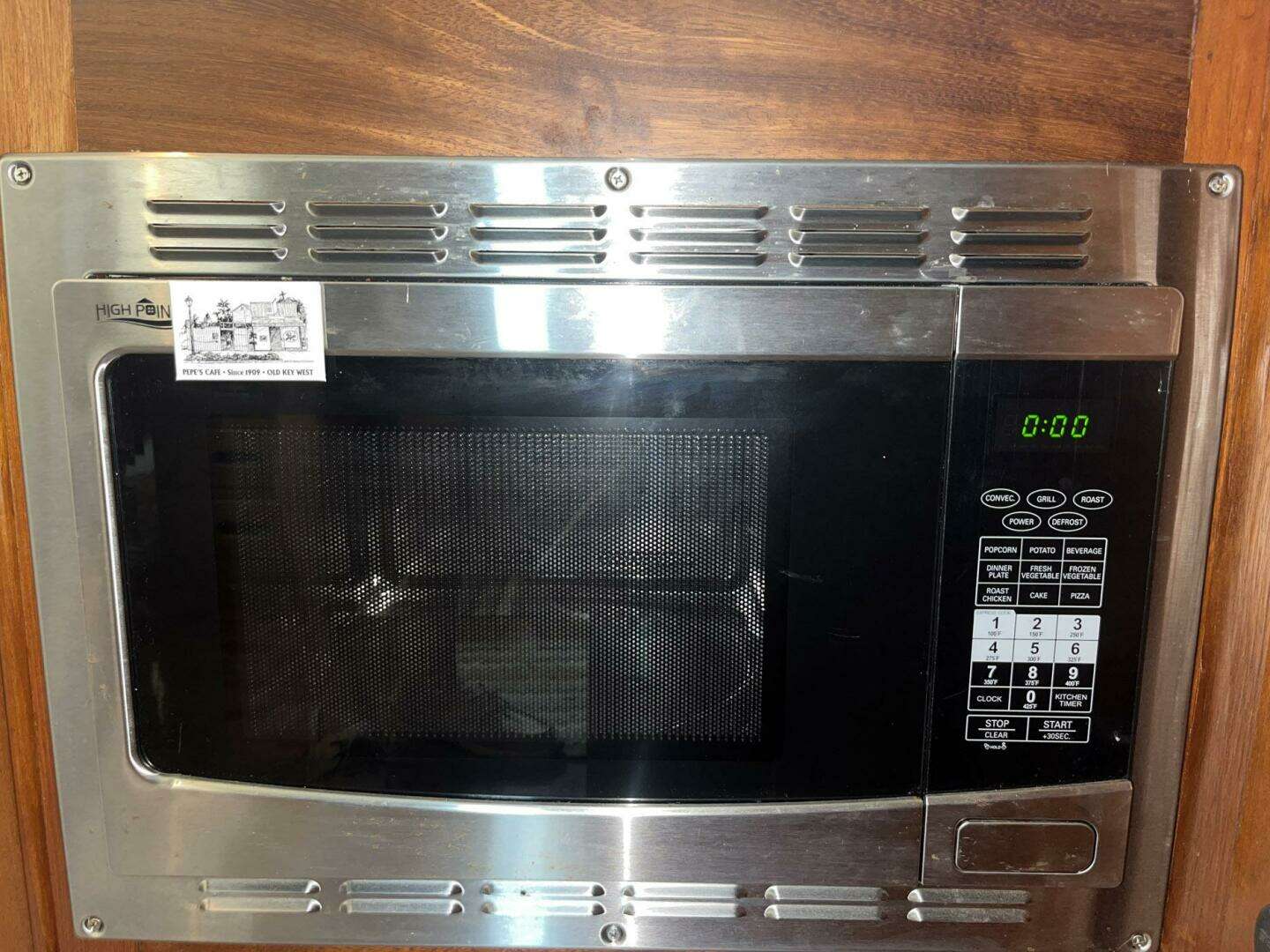 The galley on Chosen Sun is to port, across from the interior helm station. It is equipped with an Empava two-burner electric induction stove, a built-in High Pointe microwave/convection oven, a two-drawer Vitrifrigo refrigerator/freezer, and a double stainless steel sink. The faucet was replaced in 2023. There is storage in multiple cabinets and drawers, including an in-counter cabinet with dividers for dishes.