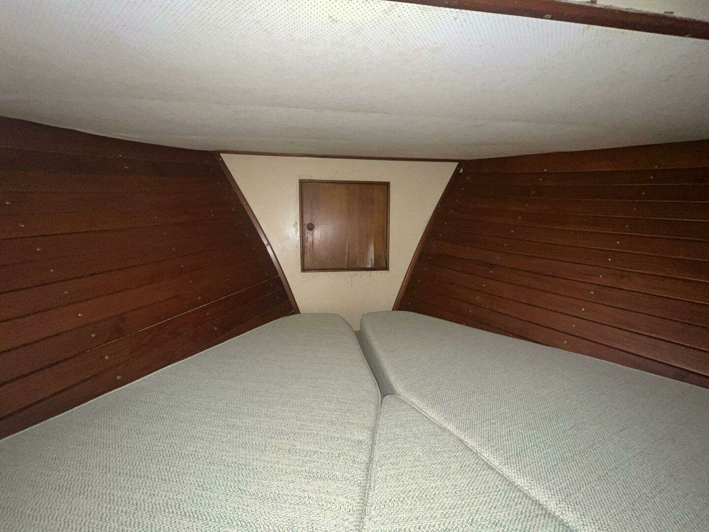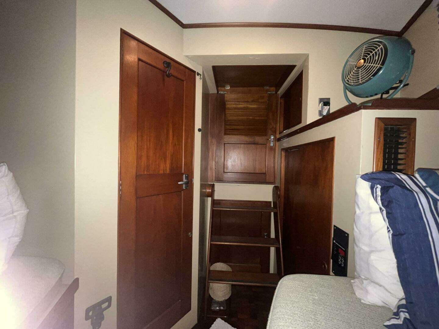 The en-suite guest stateroom on Chosen Sun is the V-Berth forward of the salon. There are four steps down, which can be removed to access the engine room. There is a privacy hatch/door. The V-Berth fabric matches the salon. The V-Berth cushions and fabric were replaced in 2023. There are two reading lights which were replaced in 2024.