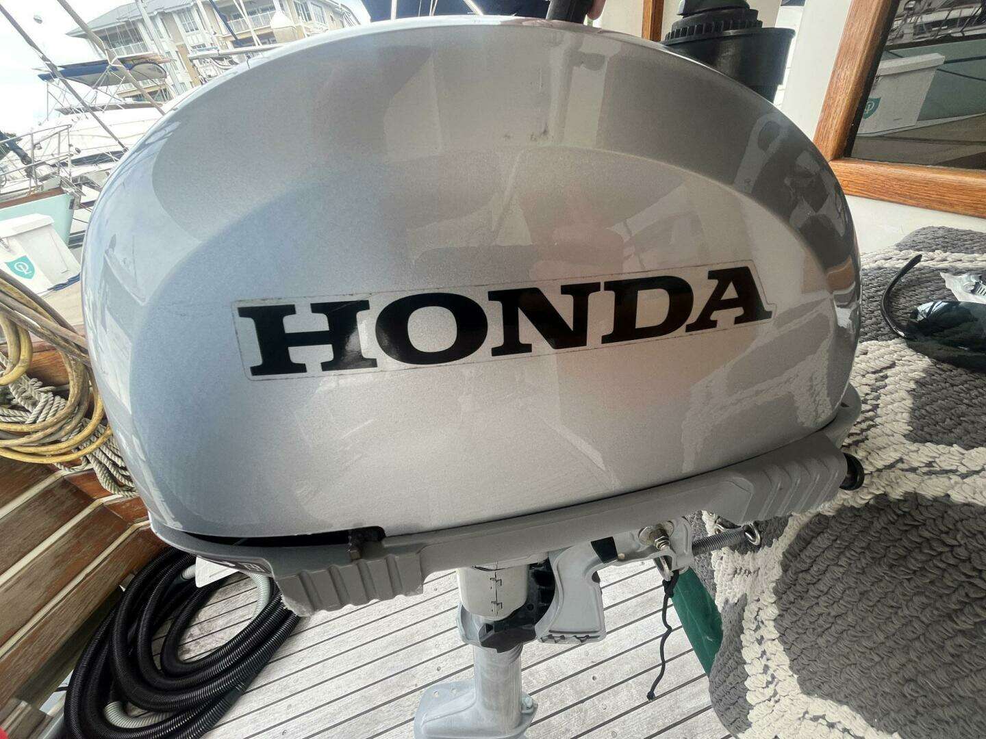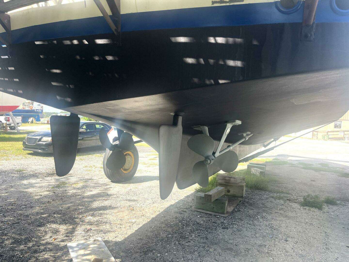 The stern is varnished teak, and the swim platform is natural teak and has a swim ladder. The bottom of the hull of Chosen Sun was regularly maintained with monthly cleaning and the replacement of anodes. The vessel was hauled out in August 2025. The bottom was professionally sanded and repainted. A barnacle barrier was also added to the propellers and running gear, and the cutlass bearings were replaced. The propellers are 23 in. 3-Blade on 1 ½ in. stainless shafts. There are spare propellers on board.