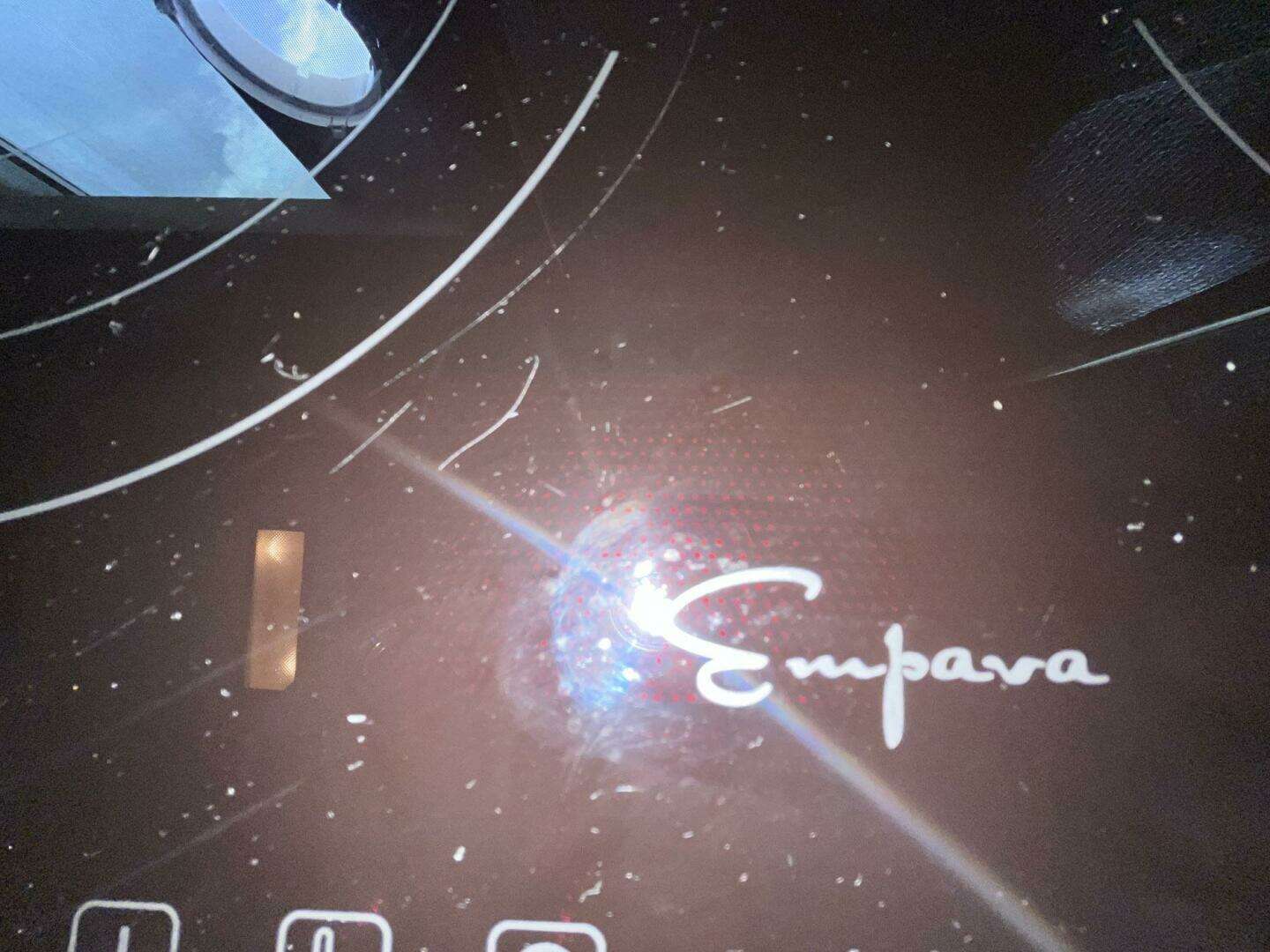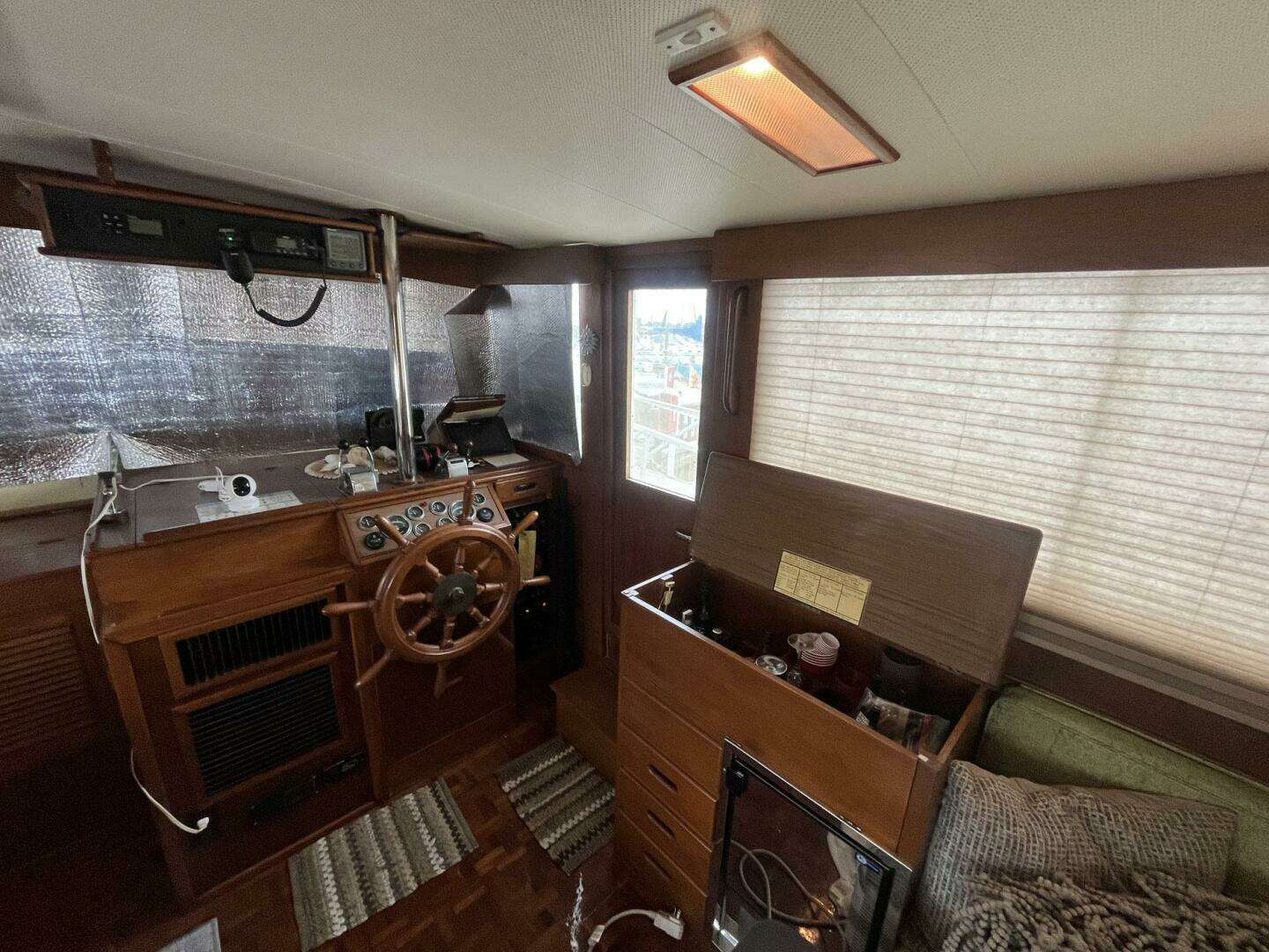 The lower helm station is to starboard. It features a teak ship’s wheel as well as a full complement of gauges, throttles, and electronics. The electrical panel is located below the helm station, to starboard. There is a three-piece windshield; the center window opens for ventilation. The port side window has a crack that has been sealed. A storage area for navigational tools is built into the helm station surface.