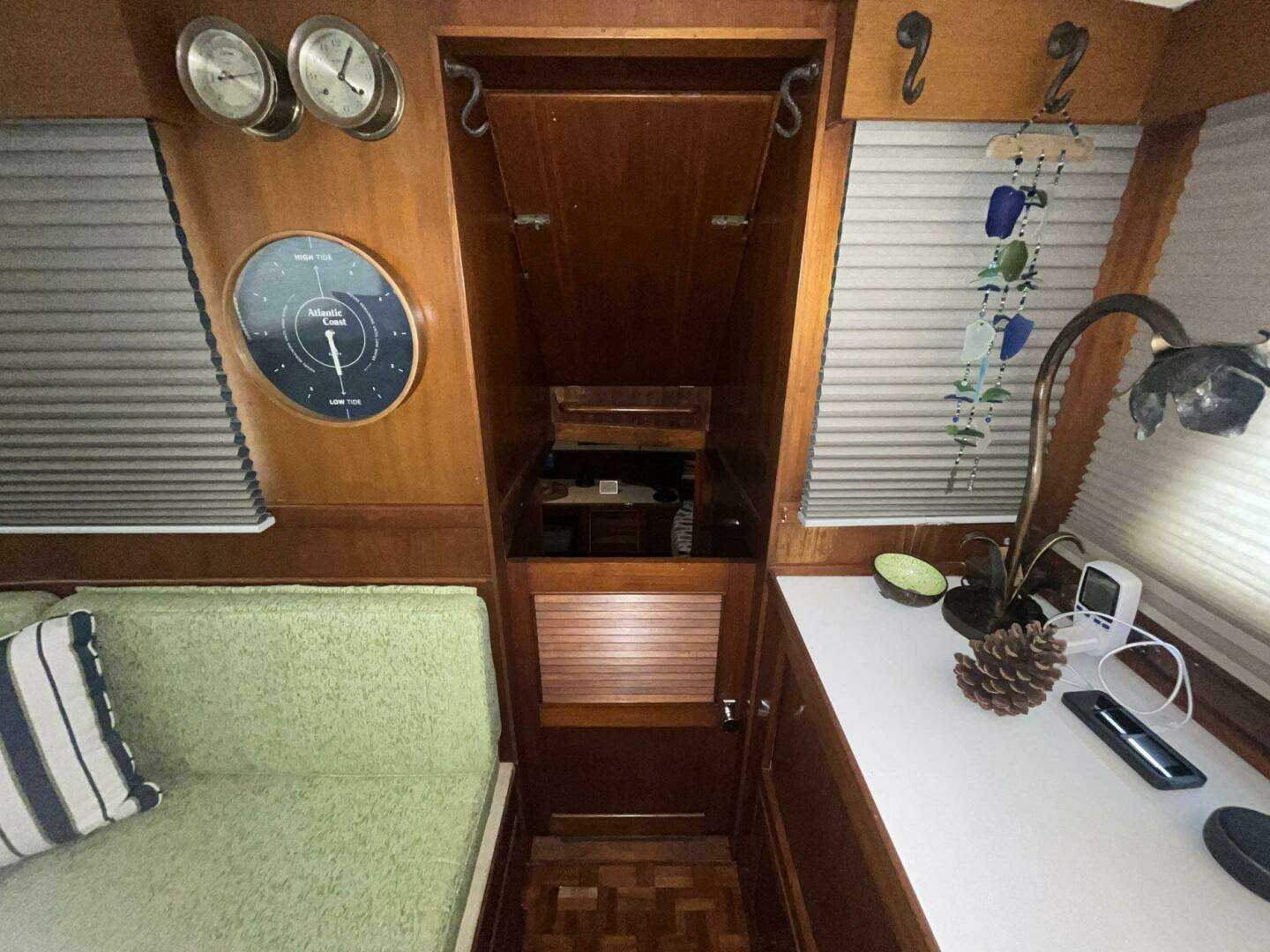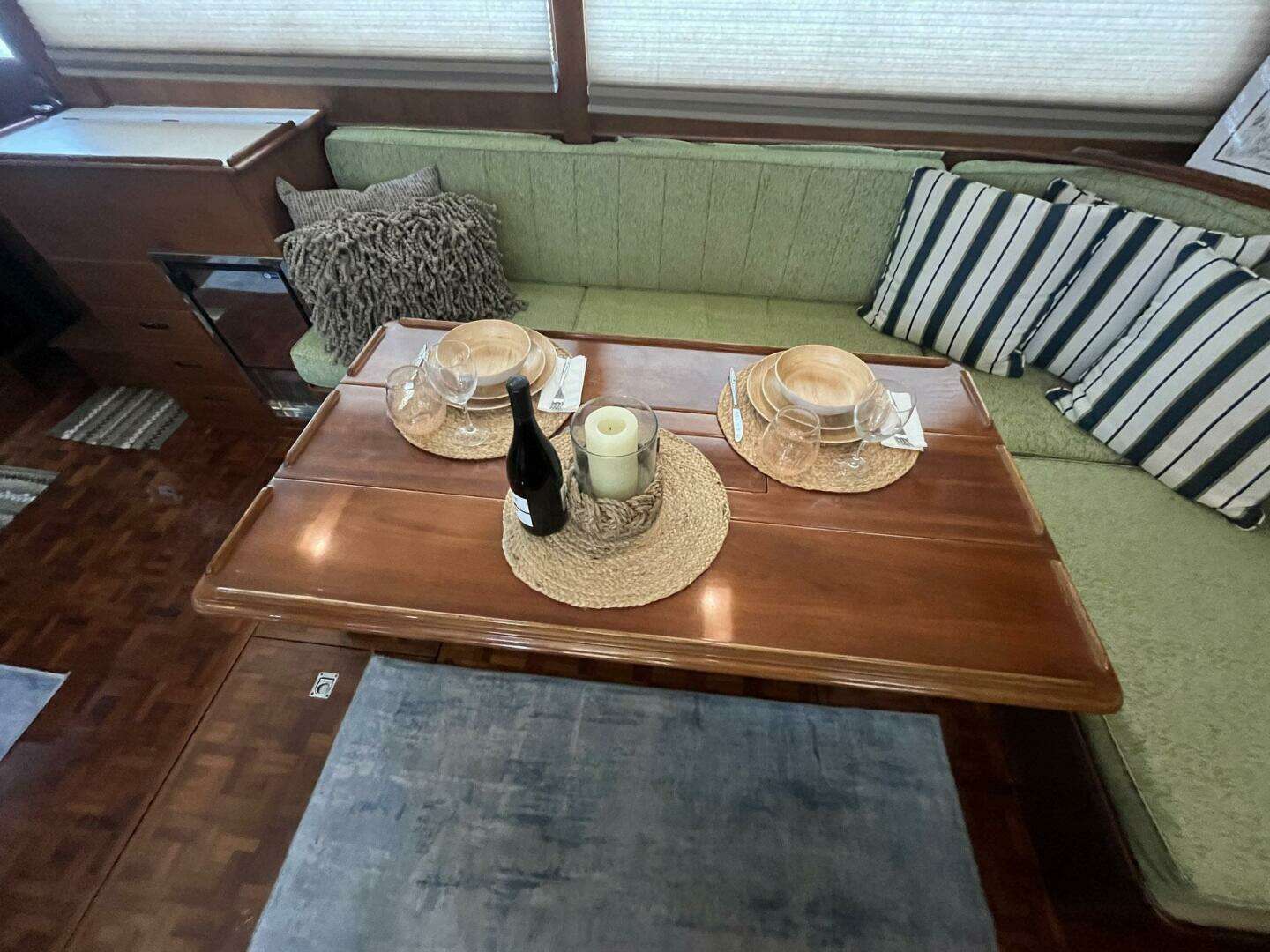 The L-Shaped settee, to starboard, is a light green fabric. The cushions and the fabric were all replaced in 2023. There is tremendous storage, as expected of a Grand Banks, under the settee. One of the highlights of the salon on Chosen Sun is the beautiful and versatile drop-leaf dining table. The center of the top opens to reveal storage; there are small hidden drawers on both sides for storage; the base features both bottle storage and magazine/book storage.