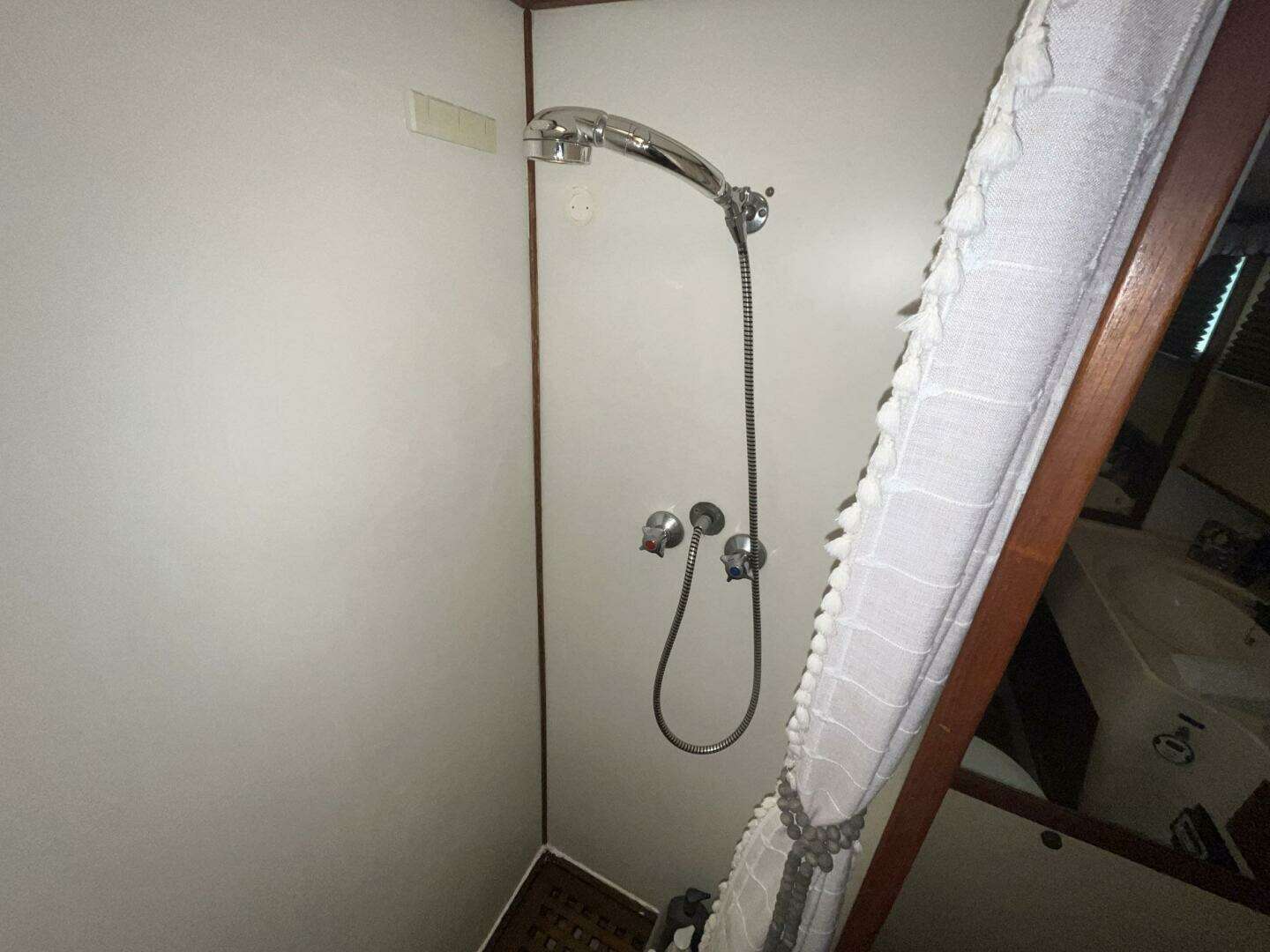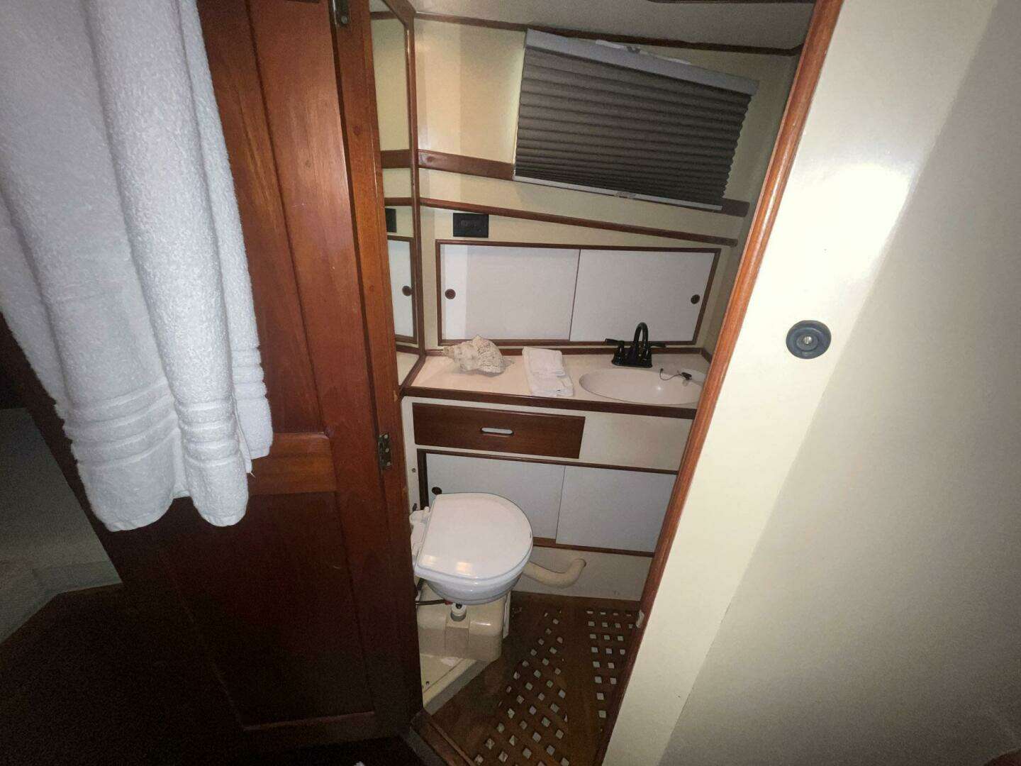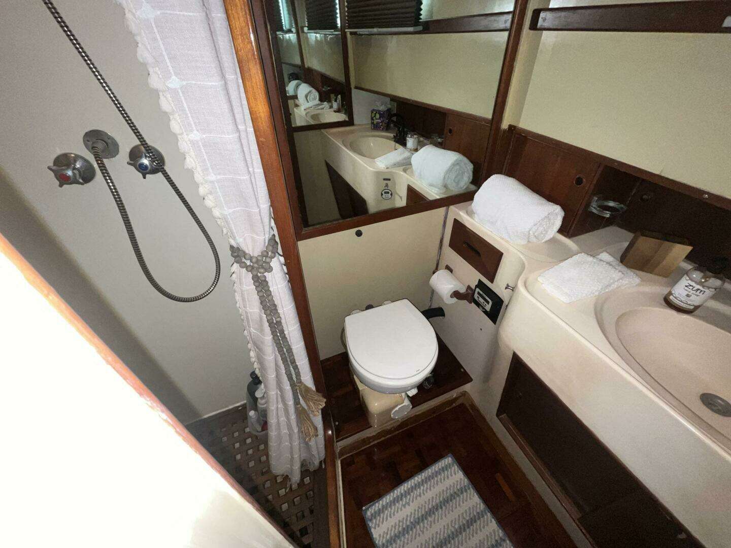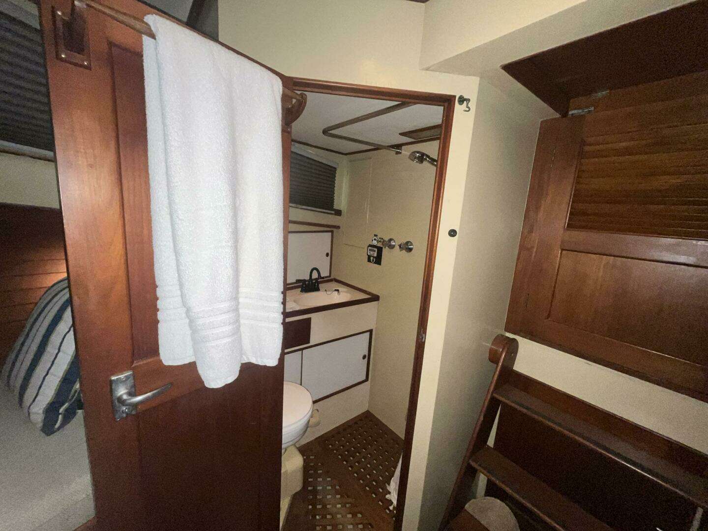 The guest head on Chosen Sun is to starboard in the Guest Stateroom. It has a full door for privacy. The entire sole is a teak grate. There is a shower curtain to separate the shower area. There is a molded counter and sink below a window with a room-darkening honeycomb blind (2023). There is storage both under and over the vanity, and a towel bar mounted on the door. The removable shower head and sink faucet were replaced in 2023. The electric toilet is attached to an Electra Scan system. A wall-mounted mirror is next to the sink. Access to the lower helm station electrical connections is through a cabinet in the bulkhead.