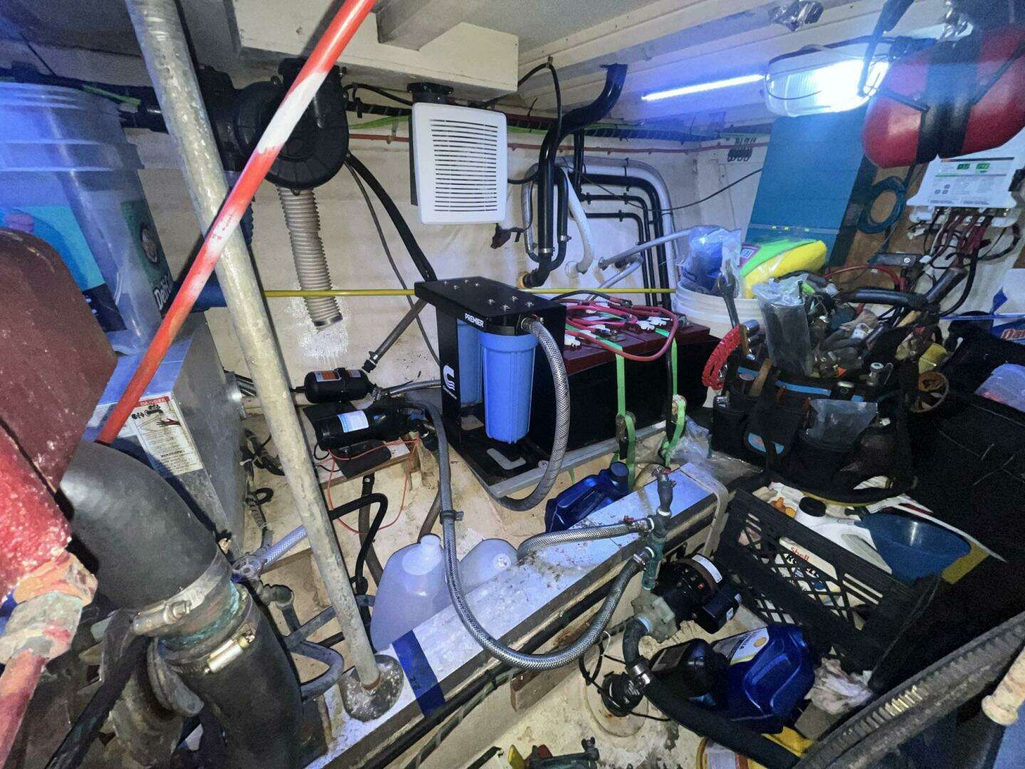 Access to the anchor locker is forward. Access to the forward area of the engine room is under the stairs down from the salon. The en-suite head is to starboard.