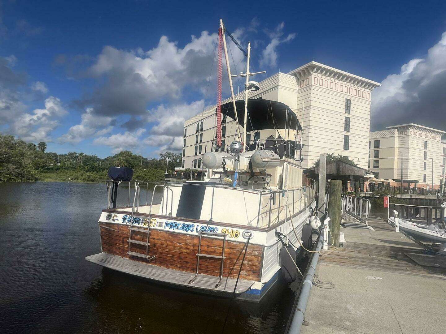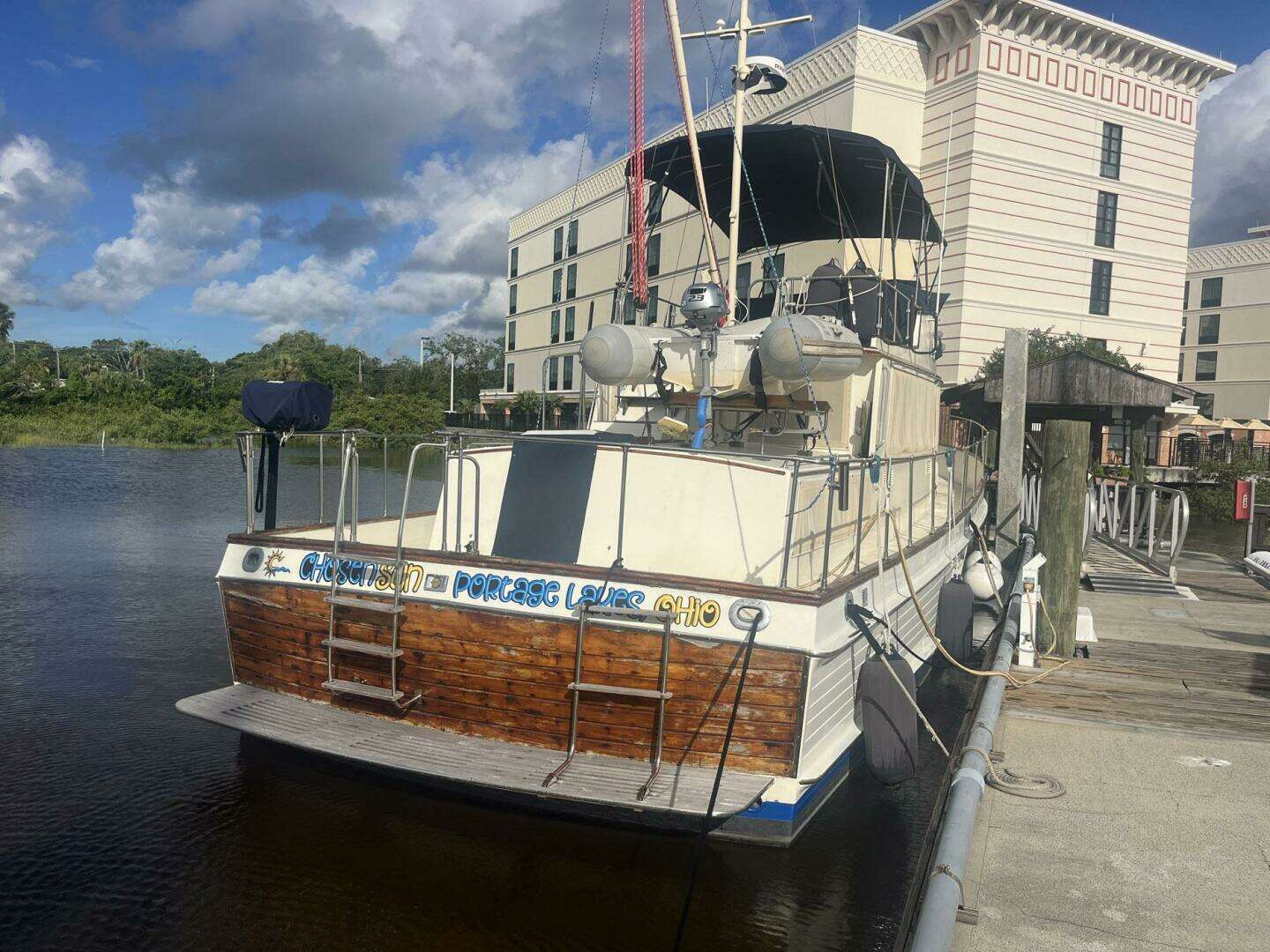 Chosen Sun is a “trunk-style” trawler with a full walk-around deck. This aids in maneuverability for line handling. The original teak decks were removed in 1998 and replaced with fiberglass with non-skid paint. The toe-rail is varnished teak. There is no wood on the handrail. The steps leading to the flybridge are natural teak, as is the sole of the flybridge.