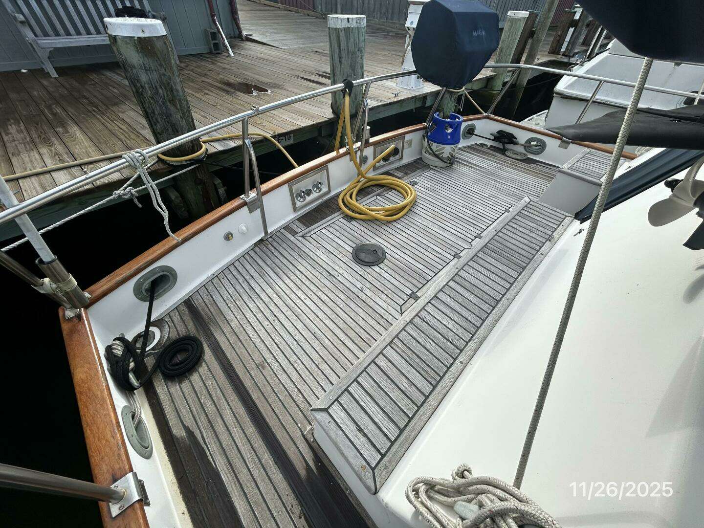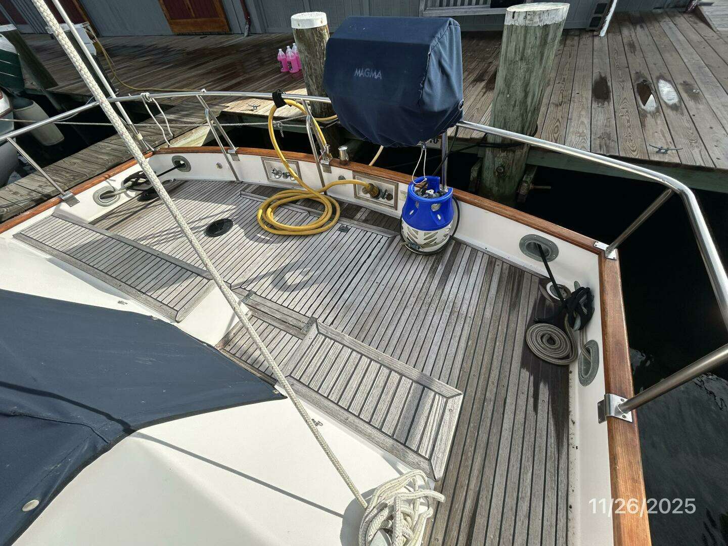 The aftdeck offers a teak deck, lazarette access, transom boarding gate, teak toe rail, stainless steel rails, same-level side deck access and a Magma stainless steel BBQ grill.