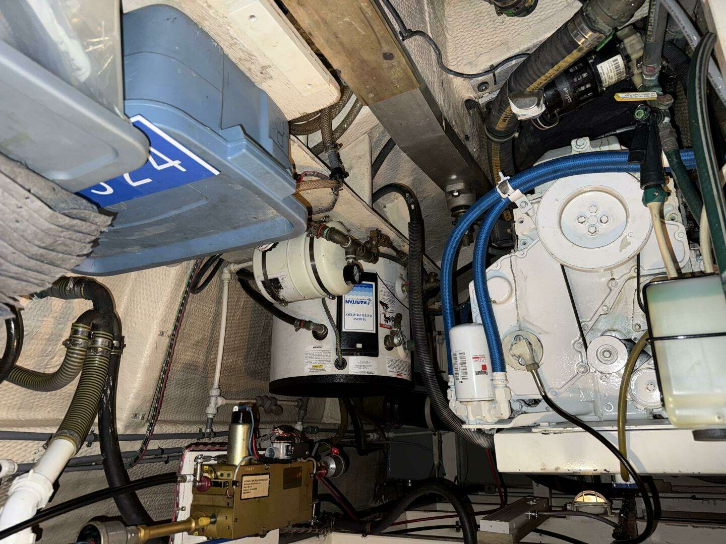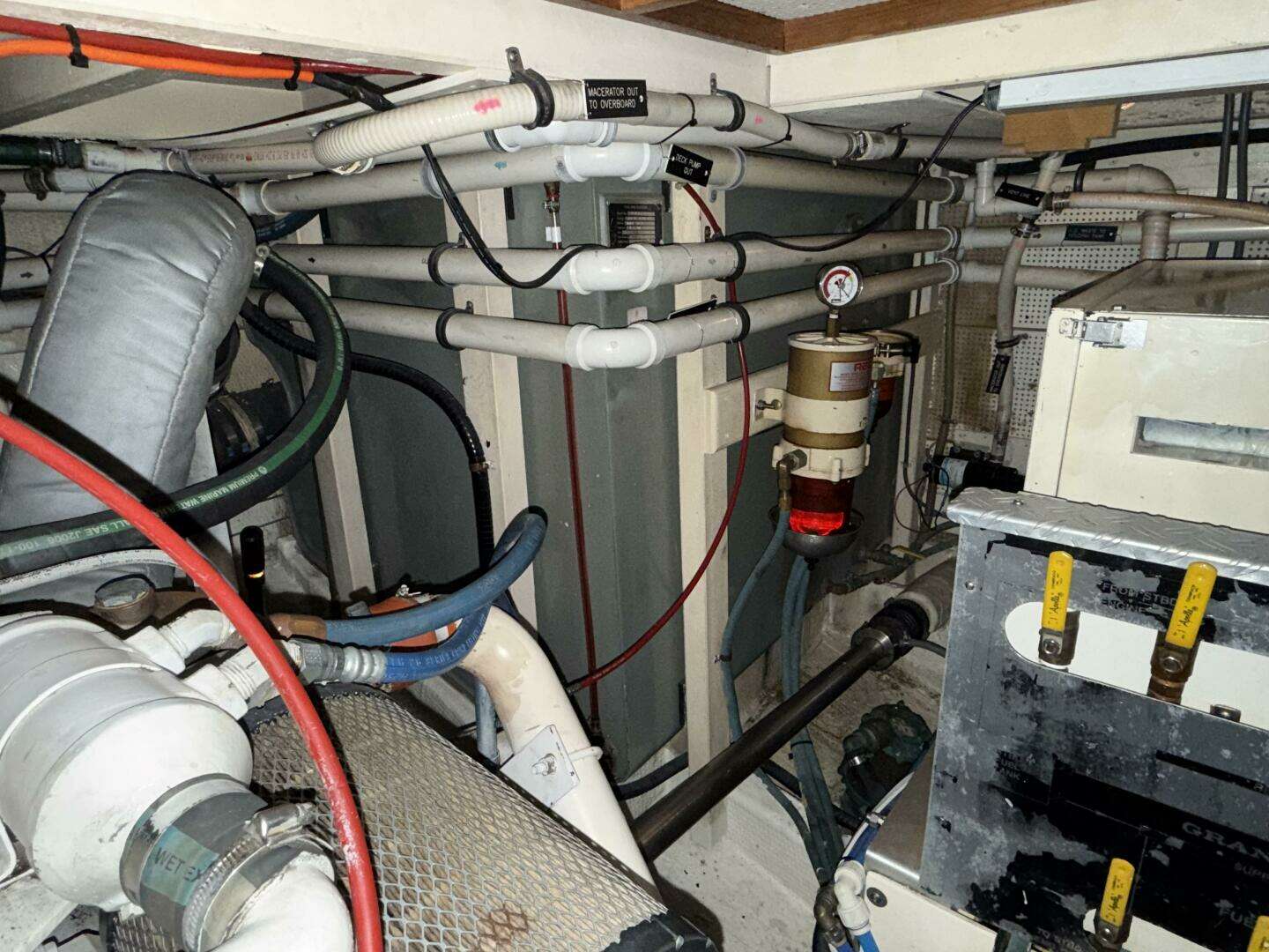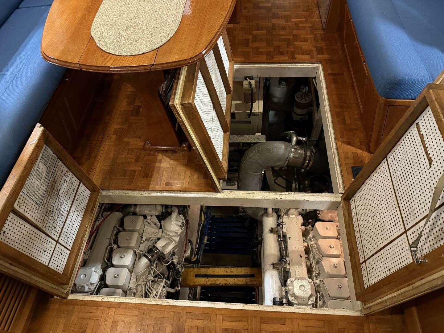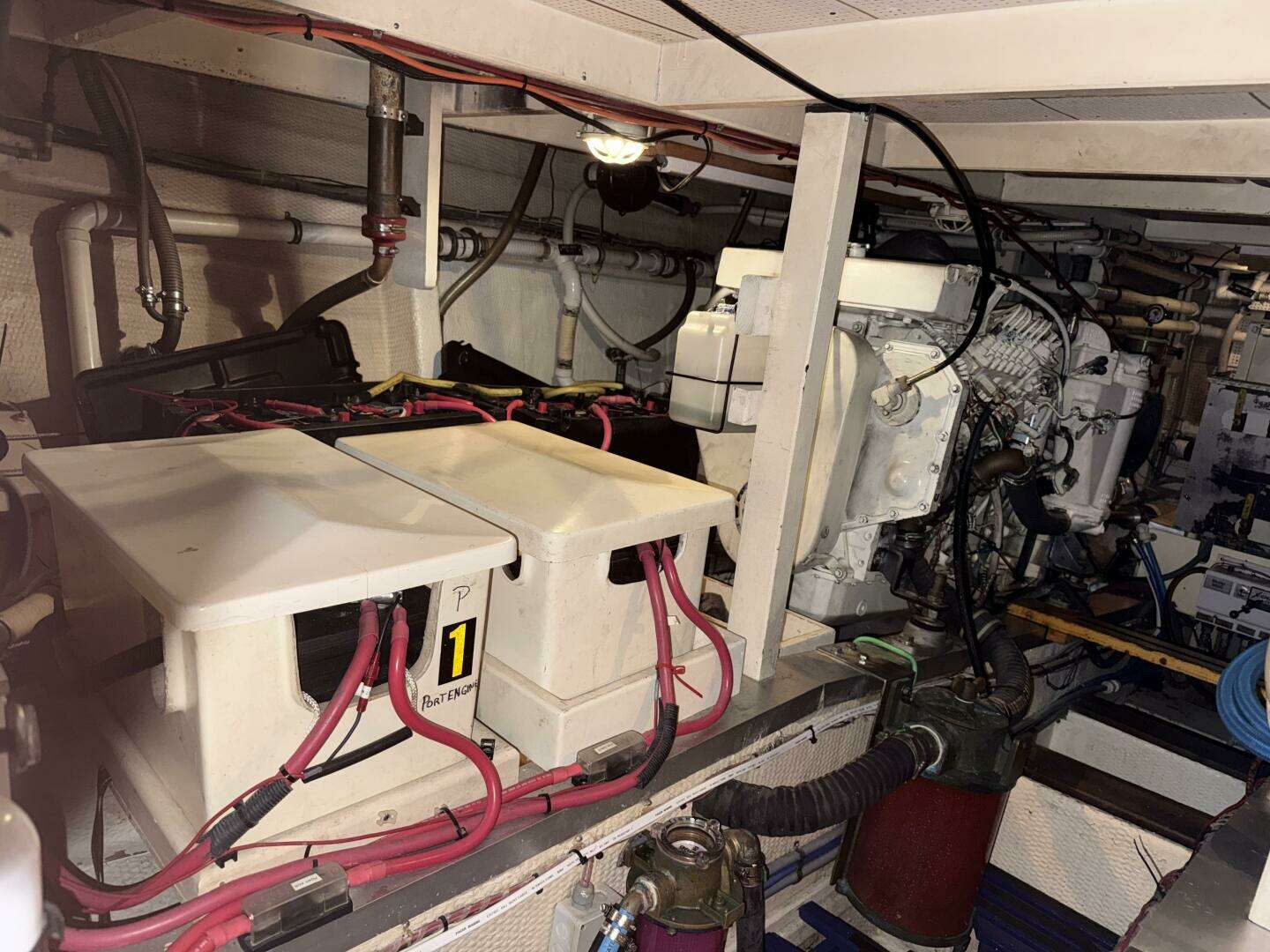 The engine room can be accessed either through a doorway behind the stairs in the aft end of the forward cabin or through lifting panels in the main salon floor. The engine room is nicely laid out with clear access to the main engine, generator, batteries, all through-hulls, and electrical wiring.