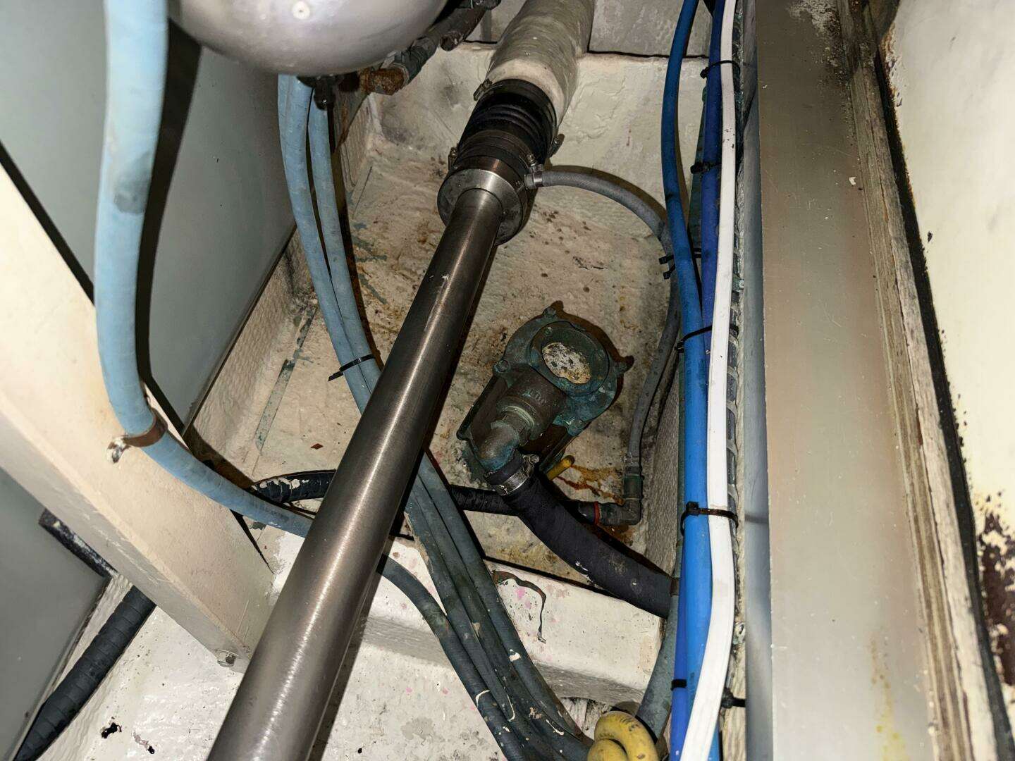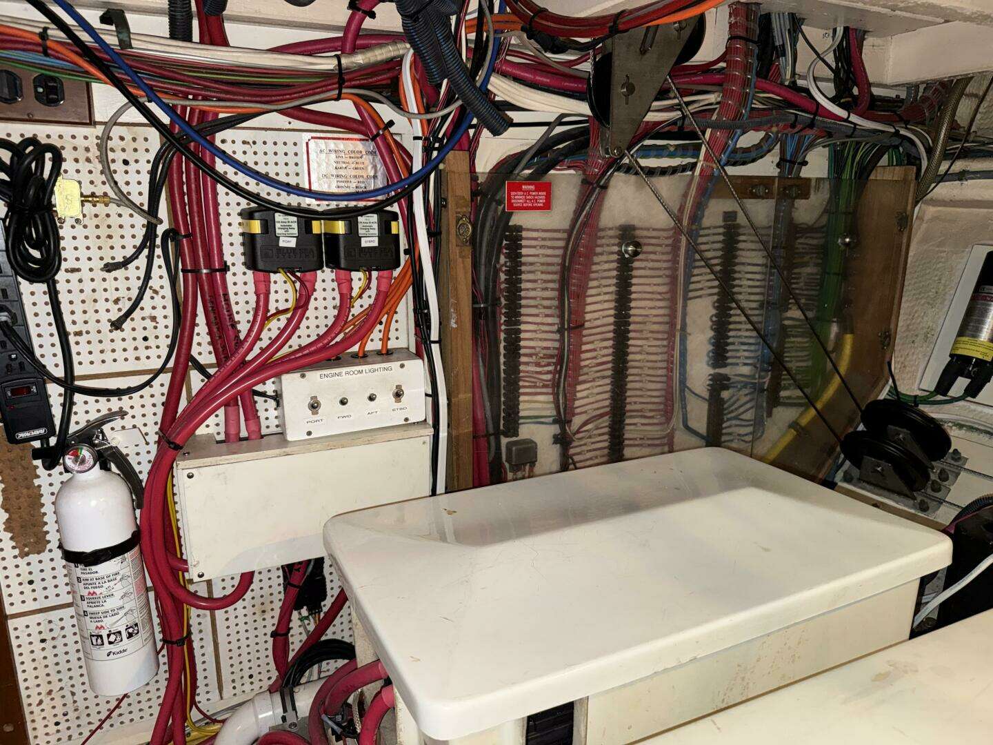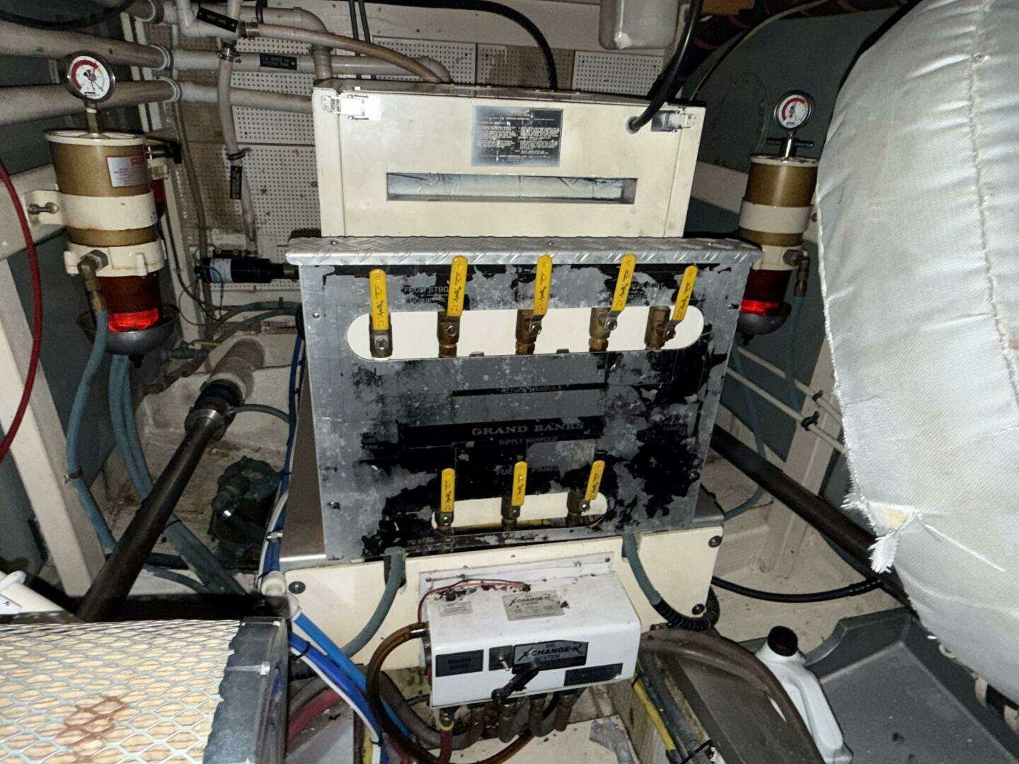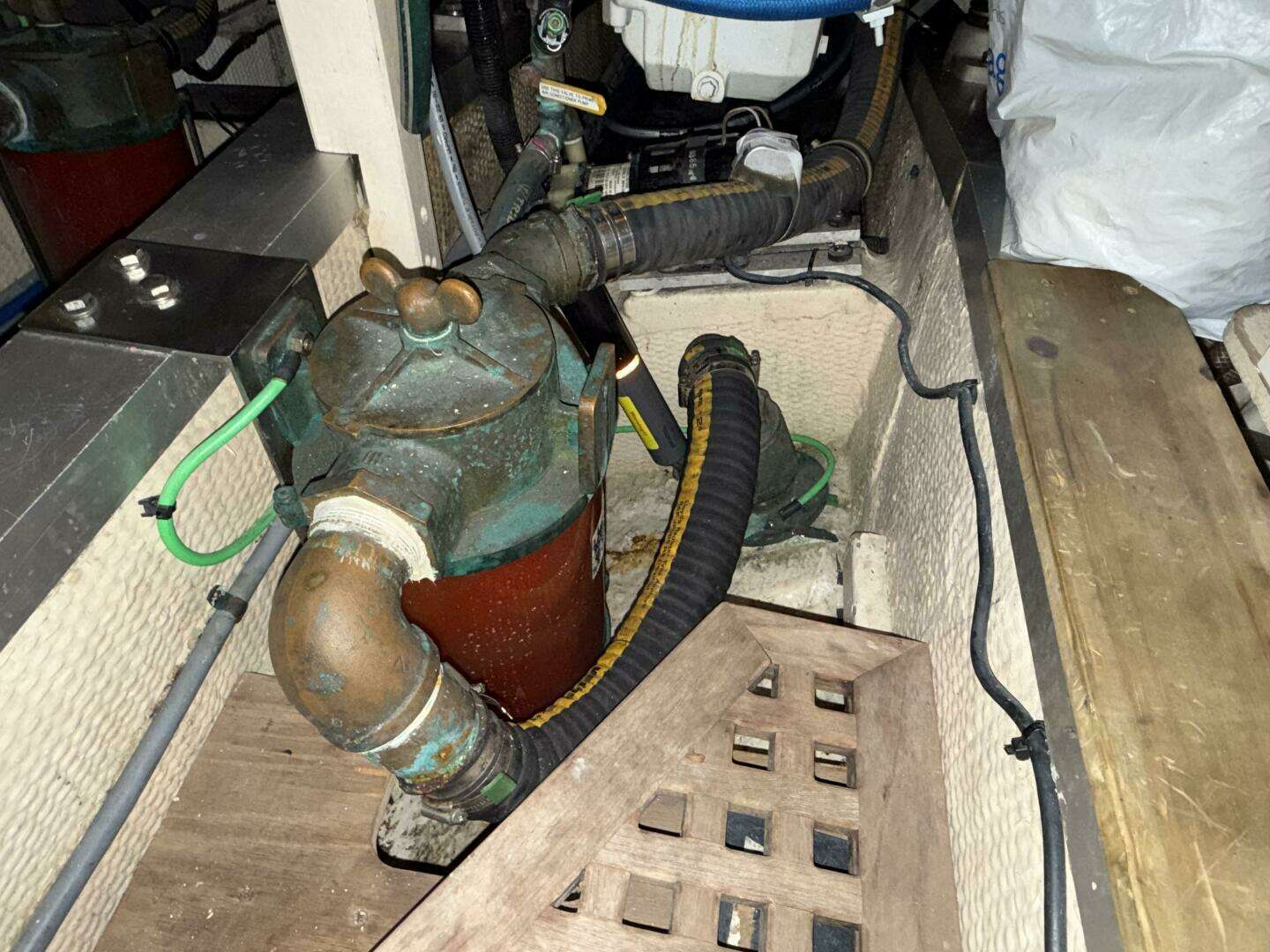The engine room can be accessed either through a doorway behind the stairs in the aft end of the forward cabin or through lifting panels in the main salon floor. The engine room is nicely laid out with clear access to the main engine, generator, batteries, all through-hulls, and electrical wiring.