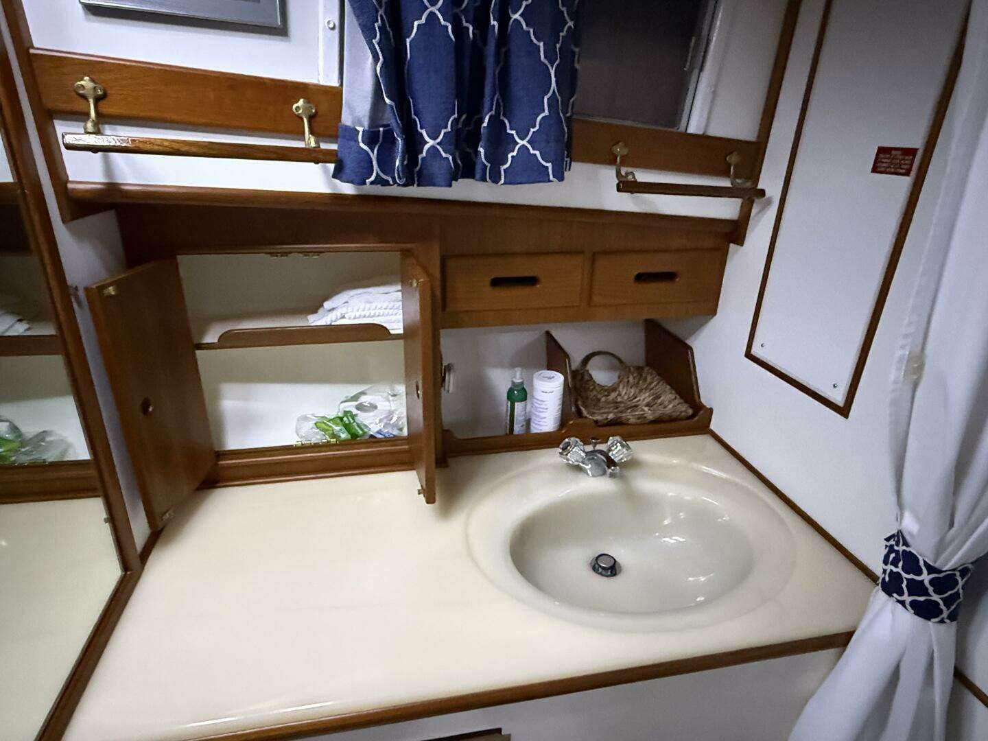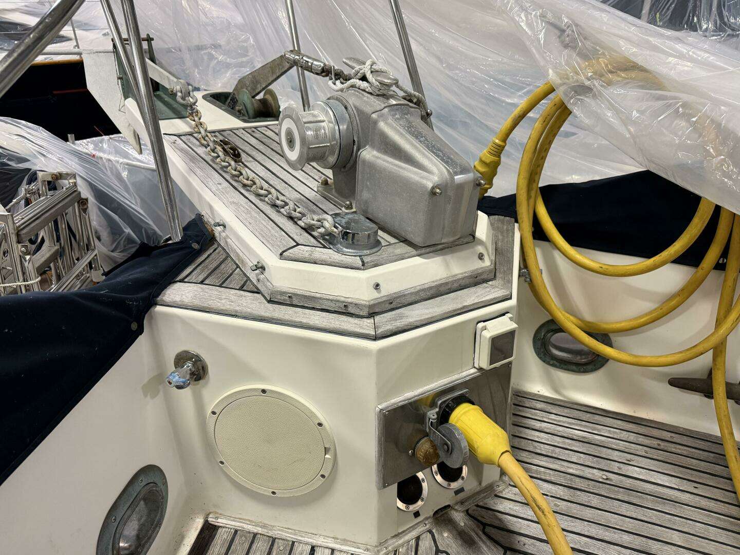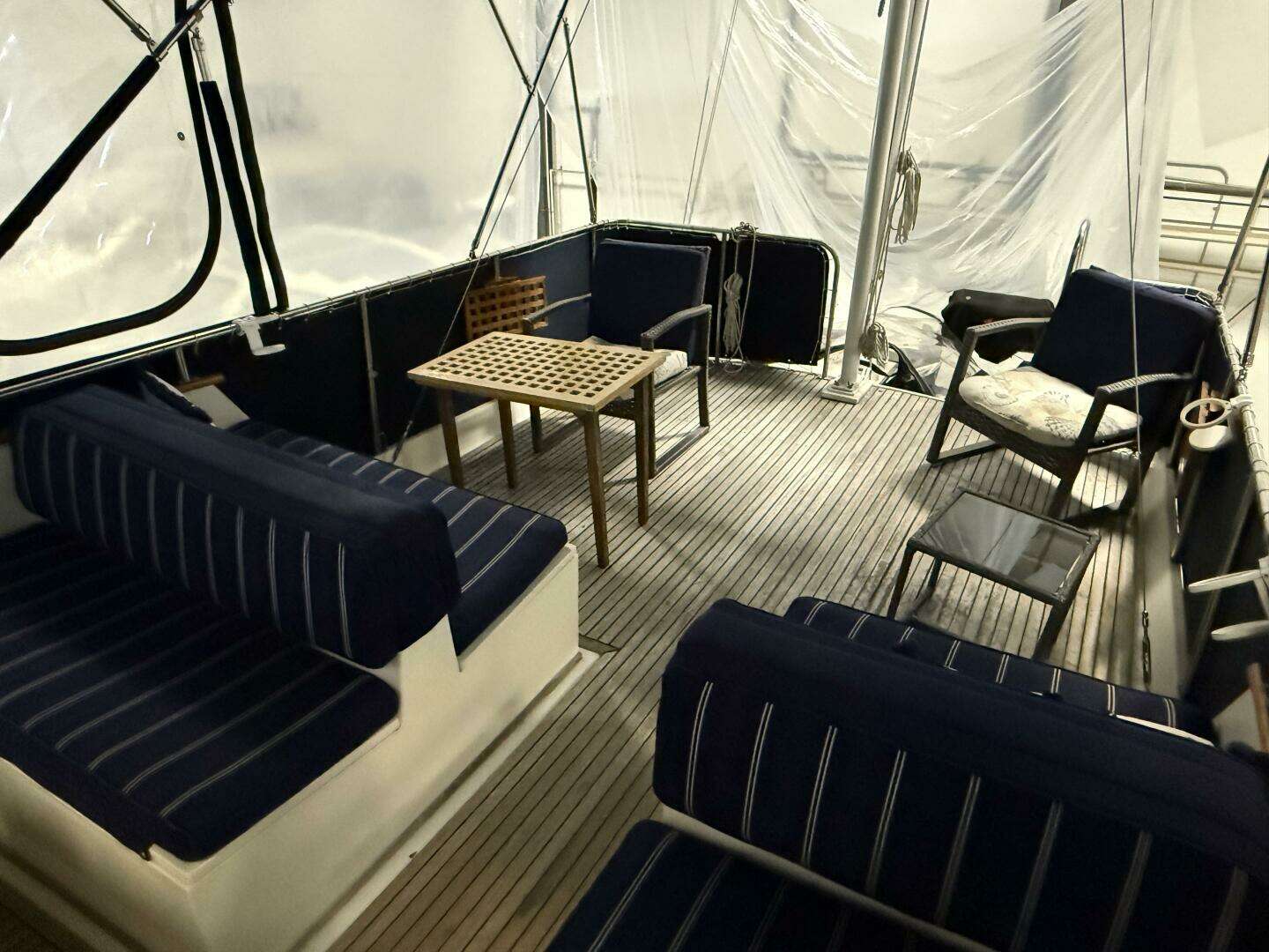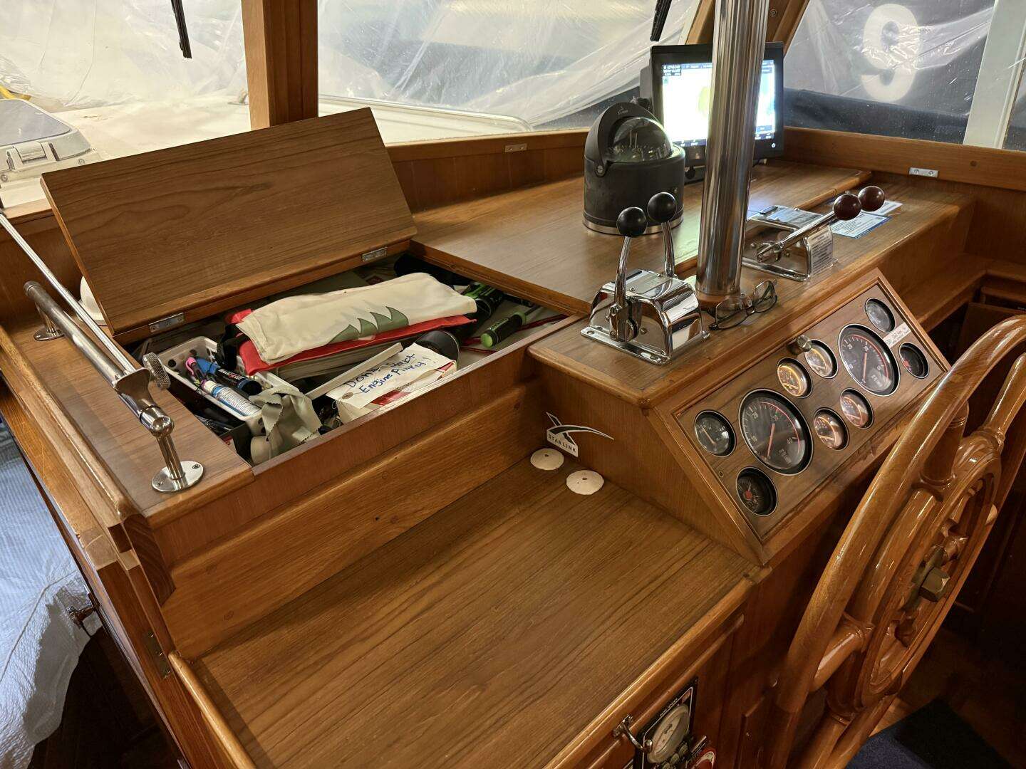 Forward of the main salon on the starboard side is the helm with all brand new navigation electronics, a beautiful teak wheel and immediate door access to the side-deck.