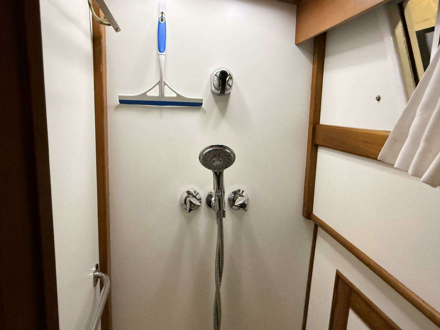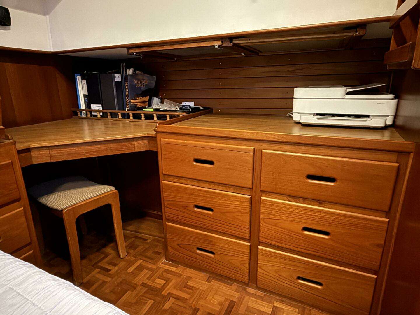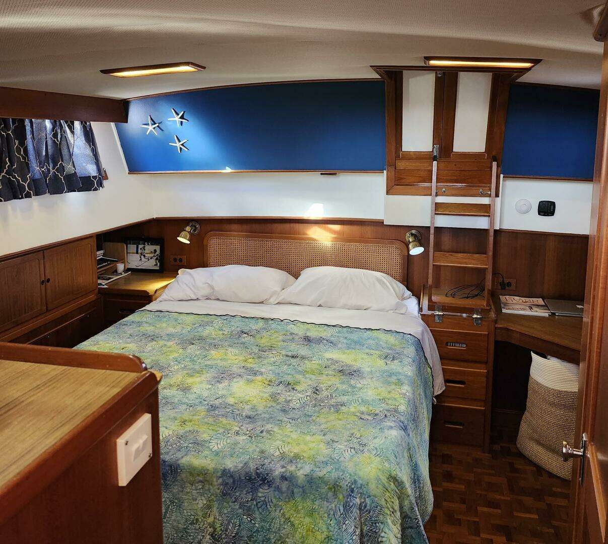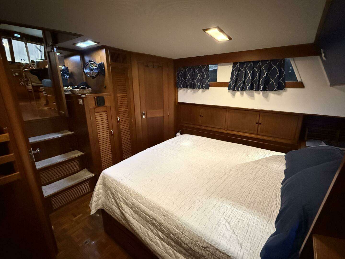 Aft of the main salon the master stateroom is down four steps. This cabin has a walk-around double berth, slightly offset to starboard which allows for a nice desk / vanity on the port side. There is a cedar closet, and plenty of drawer storage on three sides of the cabin. The aft stateroom features a "split" head with the toilet and sink in a compartment to port and a generous stall shower on the starboard side. There is a private companionway which provides immediate access to and