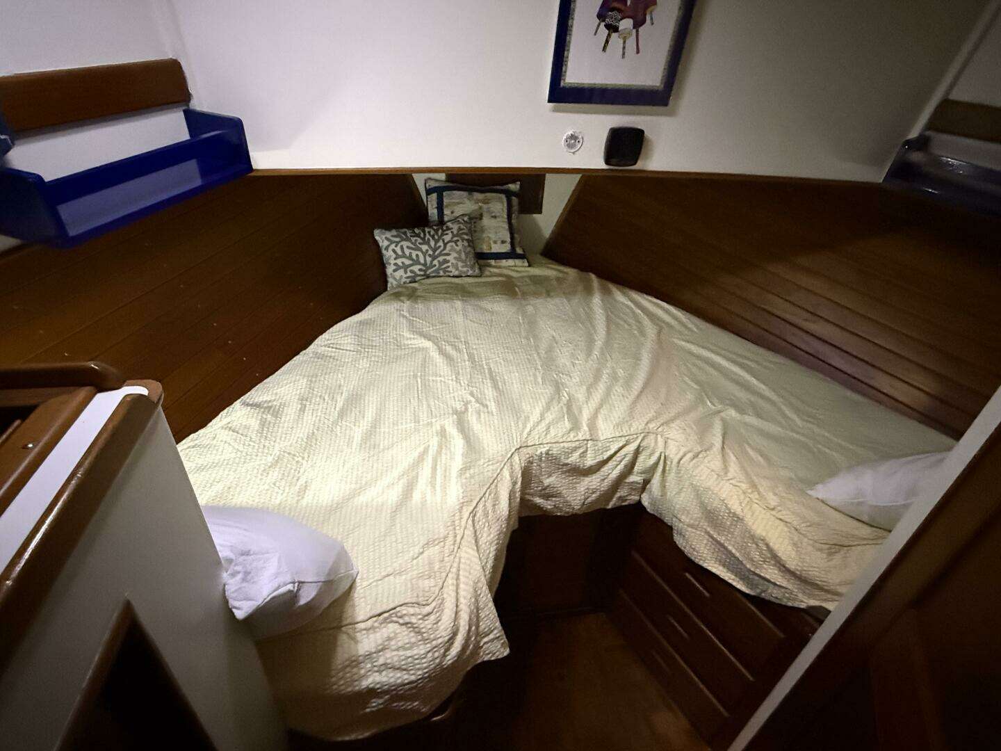 Forward of the helm and galley and down three steps is the forward cabin featuring a comfortable Vee-berth which makes a generously sized double berth and an en-suite "wet" head with shower. There is a hanging locker and plenty of drawer storage and there is door-access to the engine room behind the steps.