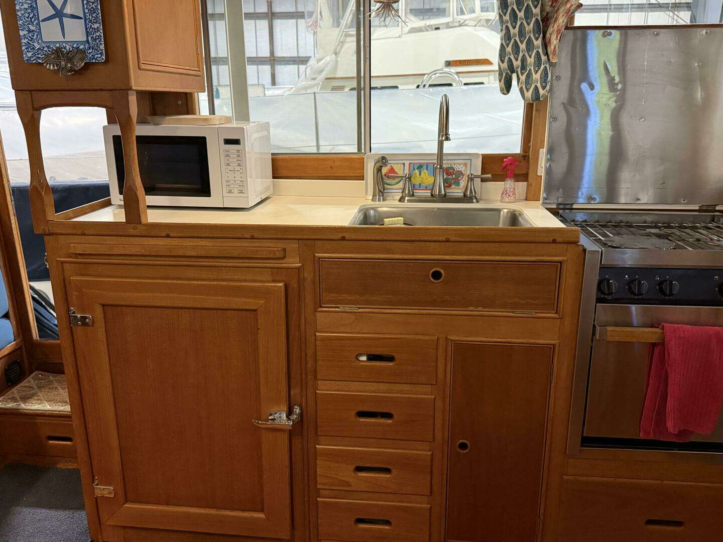 To Port, opposite the helm is the well organized and nicely laid-out galley with stainless sink, microwave oven, three burner Force 10 propane stove (2021), plenty of storage below the counter and an overhead cabinet and even a pull-out counter section to maximize working space.