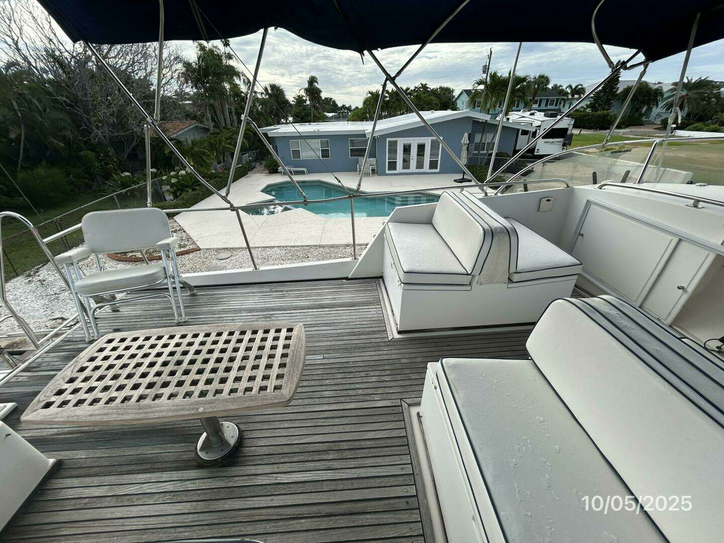 The flybridge offers a bimini, teak deck, L-shaped seating with storage and a teak table starboard aft, deck chair, benchseat with storage fore and aft on each side, storage under the helm, Morse engine controls, trim tabs controls and electronics as detailed in the electronics section of this presentation.