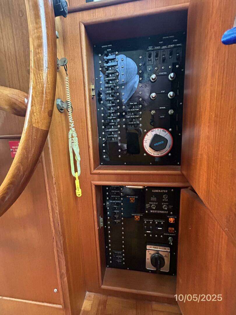 The lower helm is starboard forward in the salon and offers a side deck access door, Morse engine controls, trim tabs controls and electronics as detailed in the electronics section of this presentation.