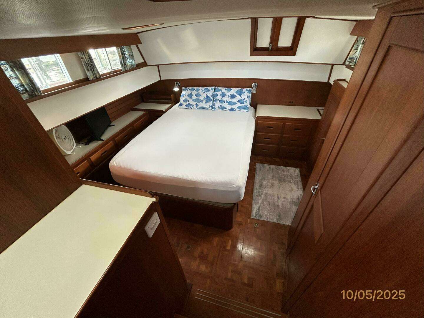 The full-beam master stateroom is aft and offers a centerline queen size berth, storage drawers and cabinets, hanging lockers, book shelf, storage under the companionway steps, nightstands, reading lights, teak parquet sole, fan, opening side windows with screens and curtains, hatch to the aftdeck port aft, ensuite head port forward and ensuite shower starboard forward.