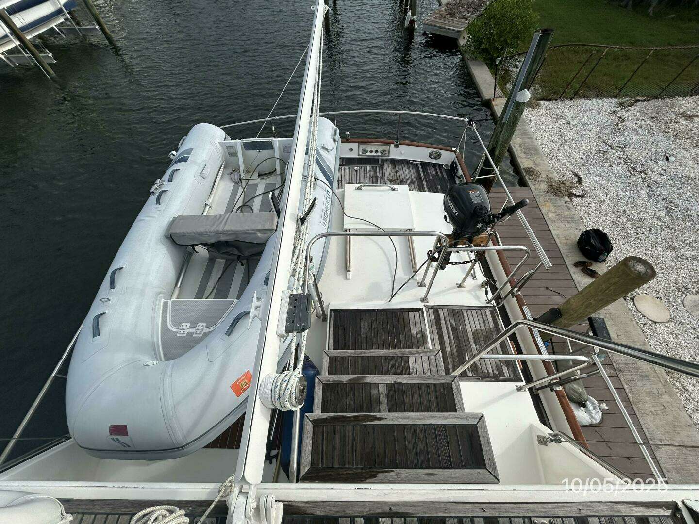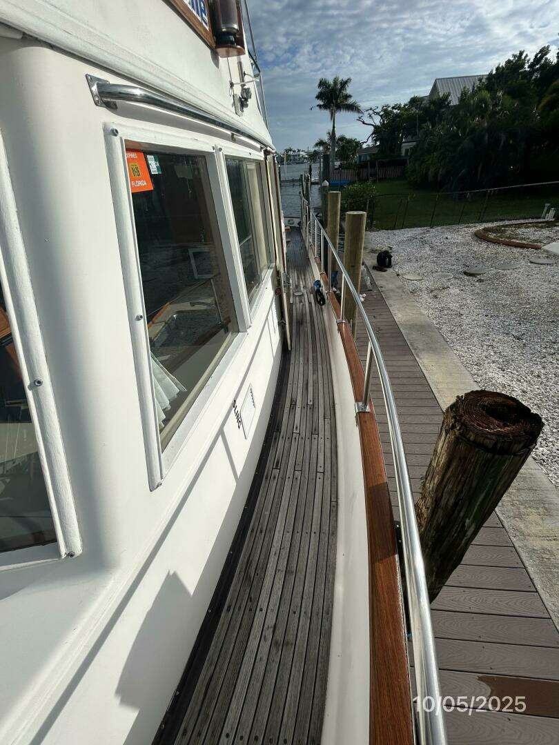 The trunk cabin offers a teak and non-skid deck, stainless steel rails, tender storage outboard bracket, mast and boom davit system, steadying sail and steps to the flybridge and port side deck.
