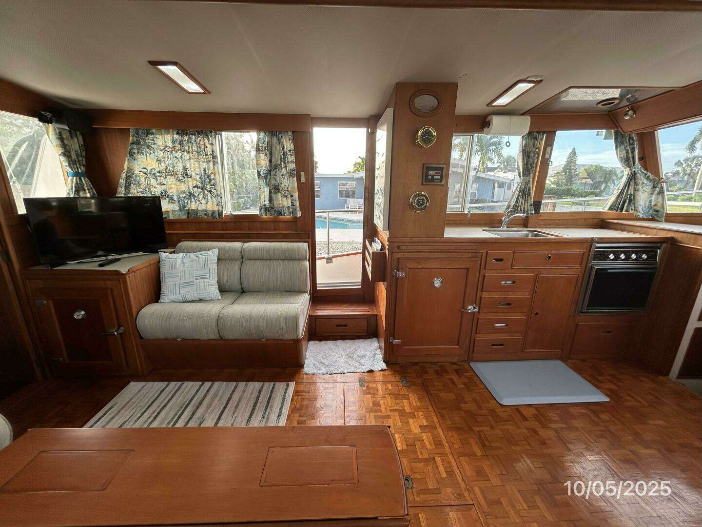 The salon offers a teak parquet sole, side deck access door on each side, a benchseat with storage port aft, lounge chair and benchseat with storage and a hi/lo folding teak table starboard aft, storage cabinet and inoperable icemaker to starboard, opening side windows with screens and curtains, opening forward window, opening aft window with a screen and curtain, book shelves, storage drawers, reading light and engine room access.