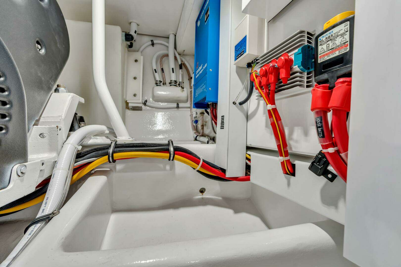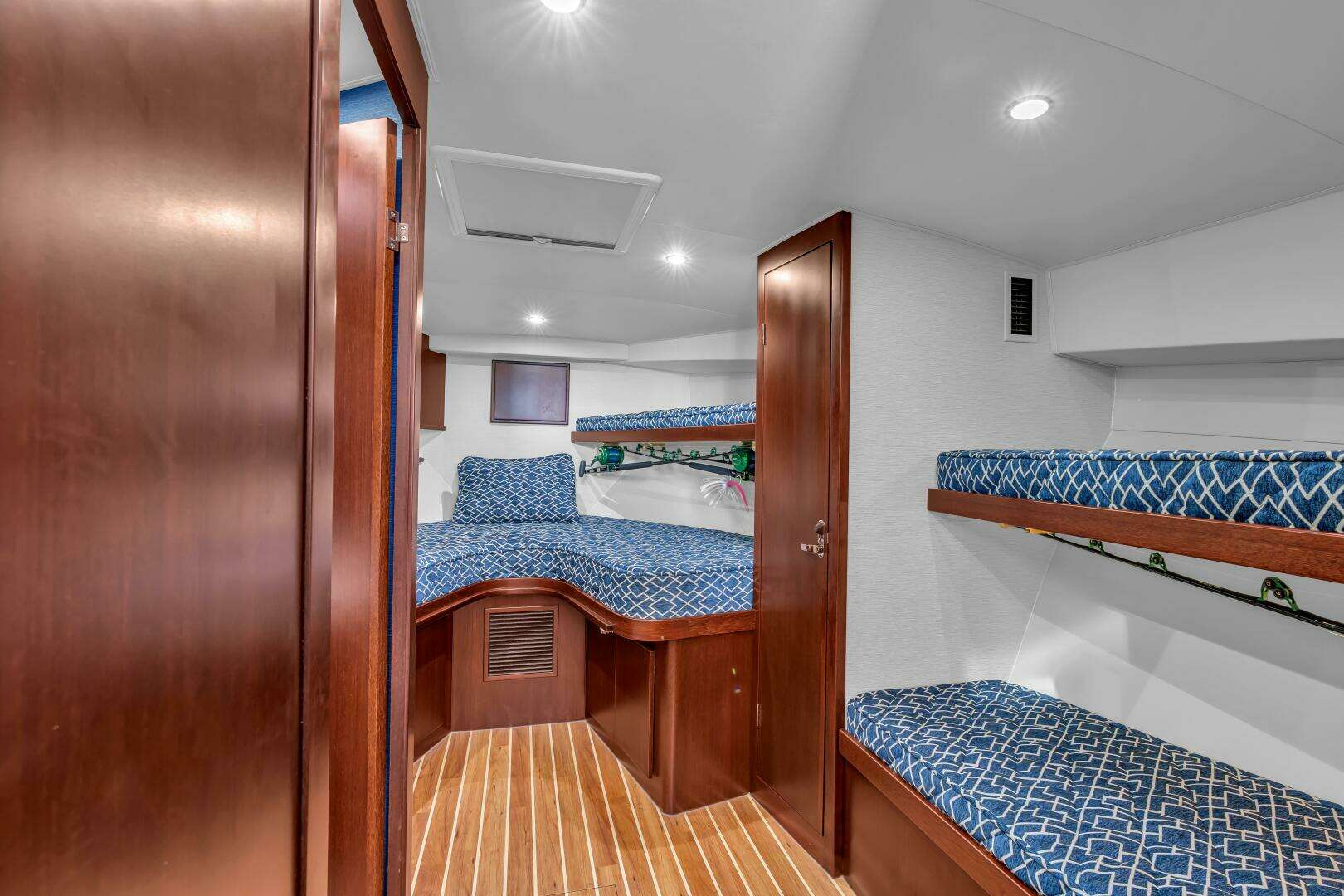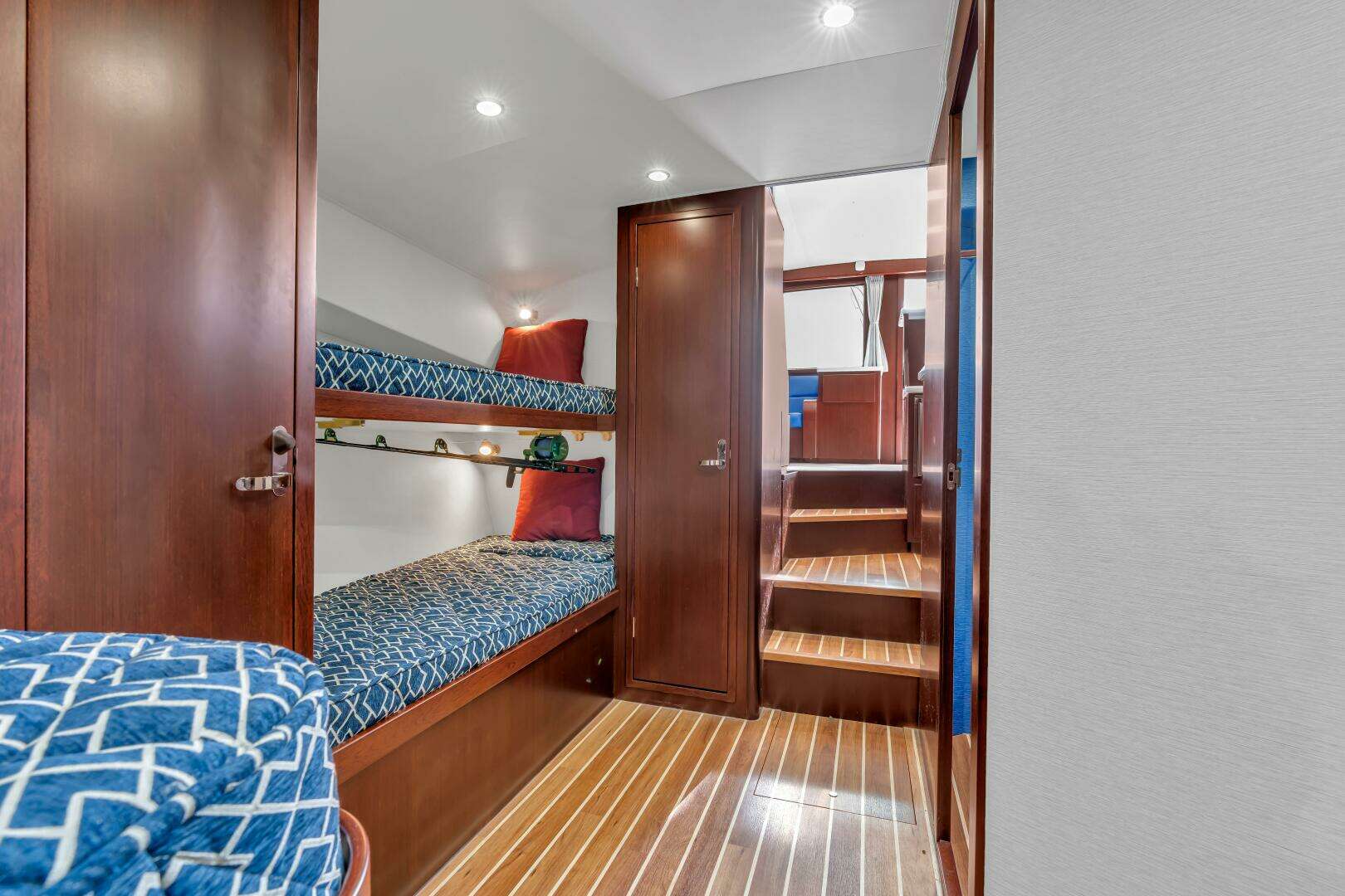 Just aft of the Master Stateroom on the starboard side there is an open upper and lower bunk arrangement with storage under lower bunk