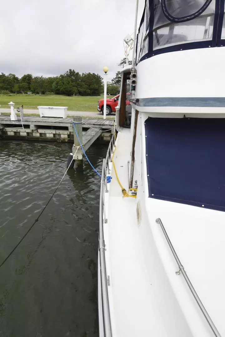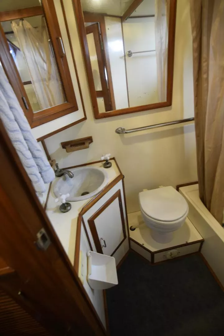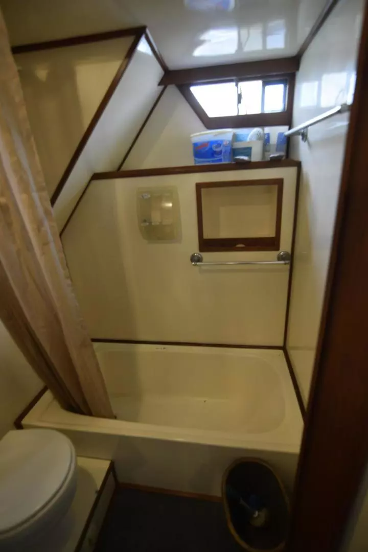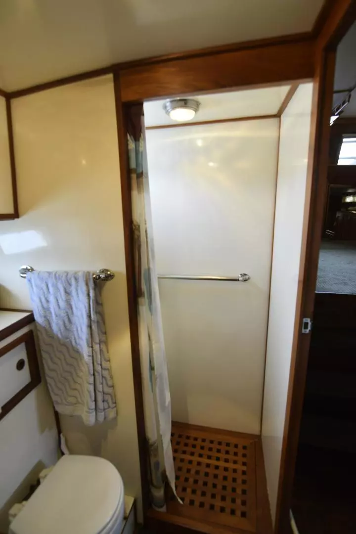 The Jefferson 42 was built on the same hull as the Jefferson 42 Convertible and is a fairly straight forward double cabin motor yacht. She offers a 2 Stateroom 2 head layout with her master aft with a queen island berth and a private head. Forward stateroom has an offset double berth with access into her forward head. Master head offer a tub/shower combo, and the guest head has an enclosed separate shower stall.