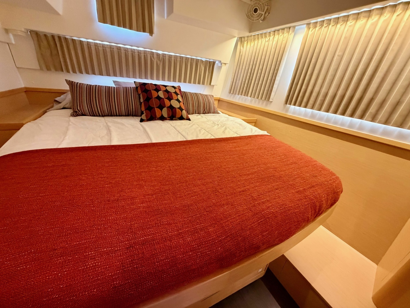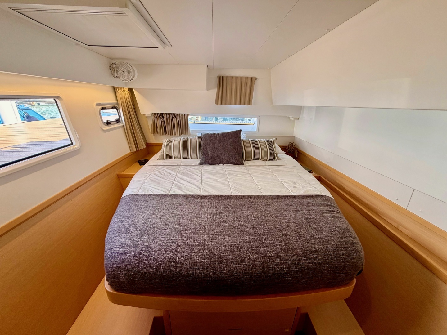 Island Hopp'r carries the sought-after three-cabin, three-head layout and has been thoughtfully upgraded far beyond her factory specification. Twin Yanmar 57hp engines deliver reliable power under motor, while a square-top mainsail and self-tacking jib make her equally rewarding under sail. The code zero with all running gear provides light wind sailing as an option.