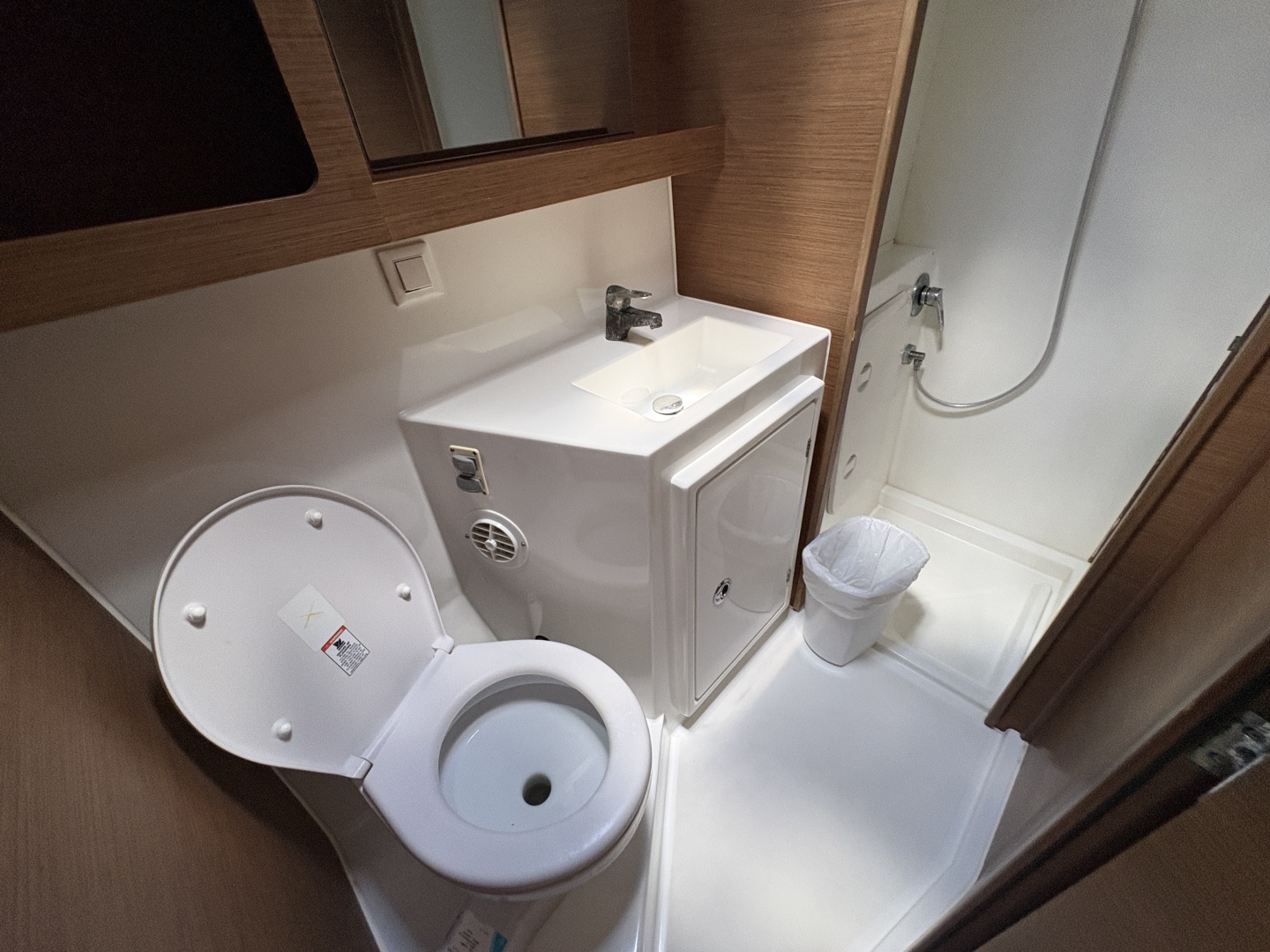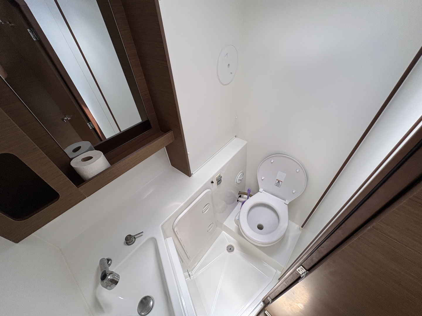 • Heads ((4)): Composite countertops; sink with hot/cold mixer; electric toilet; separate shower with Plexiglas door (aft bathrooms) or integrated shower (forward bathrooms); storage (mirrors, shelves, niches); deck hatch for ventilation