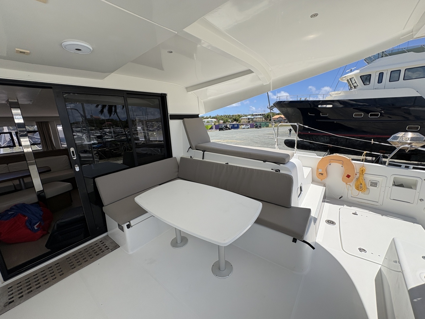 • Swim/transom fittings: Stainless steel telescopic swim ladder with fixed handle (starboard); hot/cold deck shower (starboard); small storage in transom sides