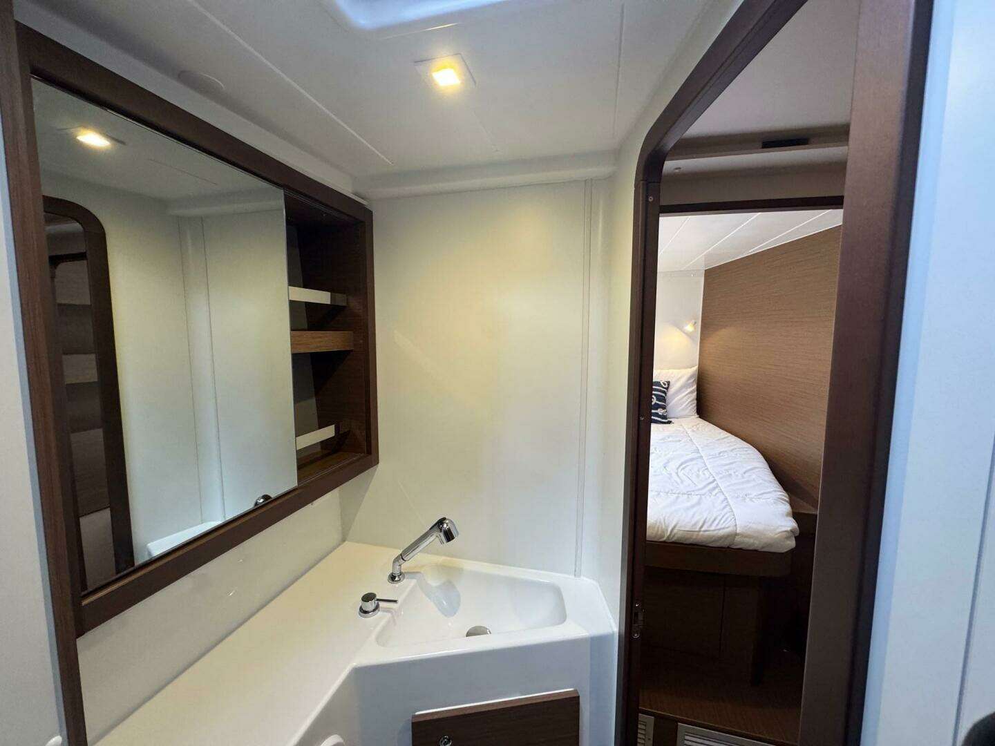 The Owner’s Version configuration dedicates the entire starboard hull to a spacious owner’s suite with an oversized head and separate shower. The port hull features two well-appointed guest cabins, each with its own en-suite head, offering excellent comfort and privacy for family or guests.
