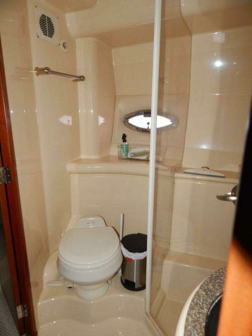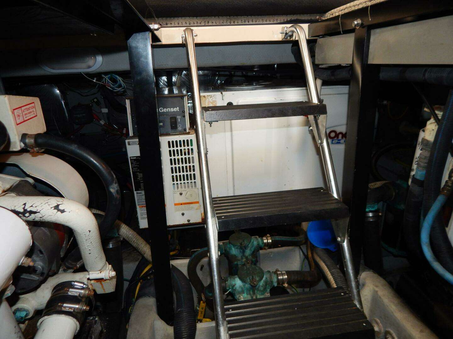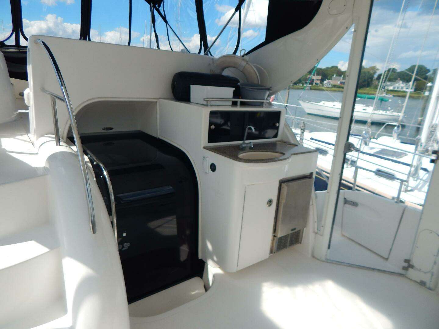 Access to the fully enclosed aft deck is up 4 steps through the companionway where there is an aft settee, a wet bar and ice maker with storage to starboard, there are port and starboard clear wing doors to access the side decks. Up 3 molded steps to the flybridge there is a full enclosure with new isinglass, a large L-shaped settee to starboard, a mates seat to port with refrigerator aft and a center Captain's seat.