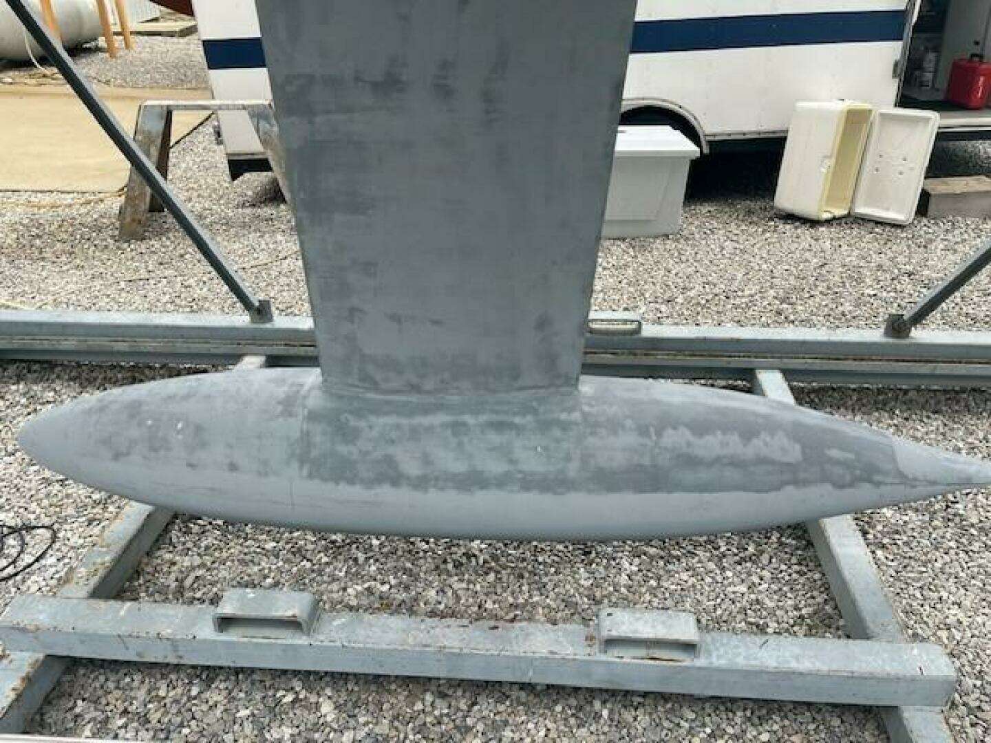 Steel fin with antimony alloyed lead torpedo bulb and with upper flange recessed into hull, hi-tensile steel bolts