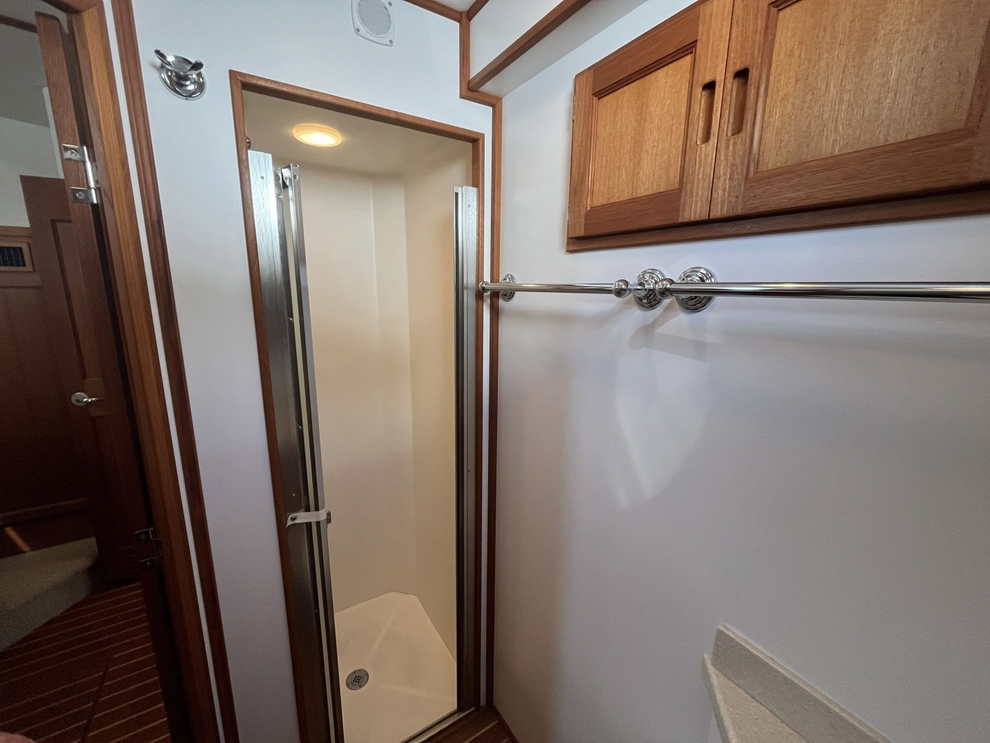 The bridge on the Nordic Tug is reminiscent of much larger yachts, featuring a large chart table, expansive cockpit and convenient access directly to the deck. Powered by Cummins QSC 8.3 540 HO, the Nordic 42's top speed is 14 knots and cruises at an efficient 1.5 miles per gallon at 9 knots. Built to take the roughest passage with confidence, the hard chine semi-displacement hull gives this tug a stable and quiet ride. The full keel protecting the rudder and propeller offers the owners confidence while cruising. She features teak and holly soles throughout, a spacious walk-around queen stateroom with private head, guest stateroom with head, U-shape galley, and large salon.