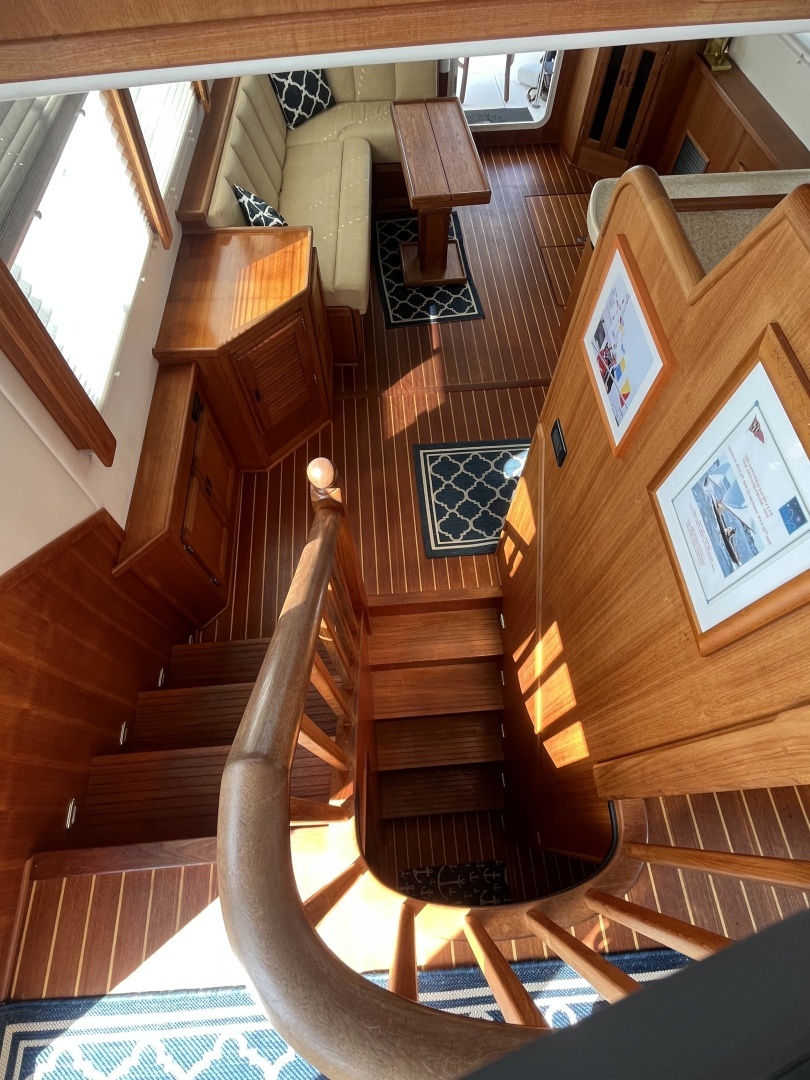 - Teak and holly cabin sole, cherry hull ceiling, teak doors and trim