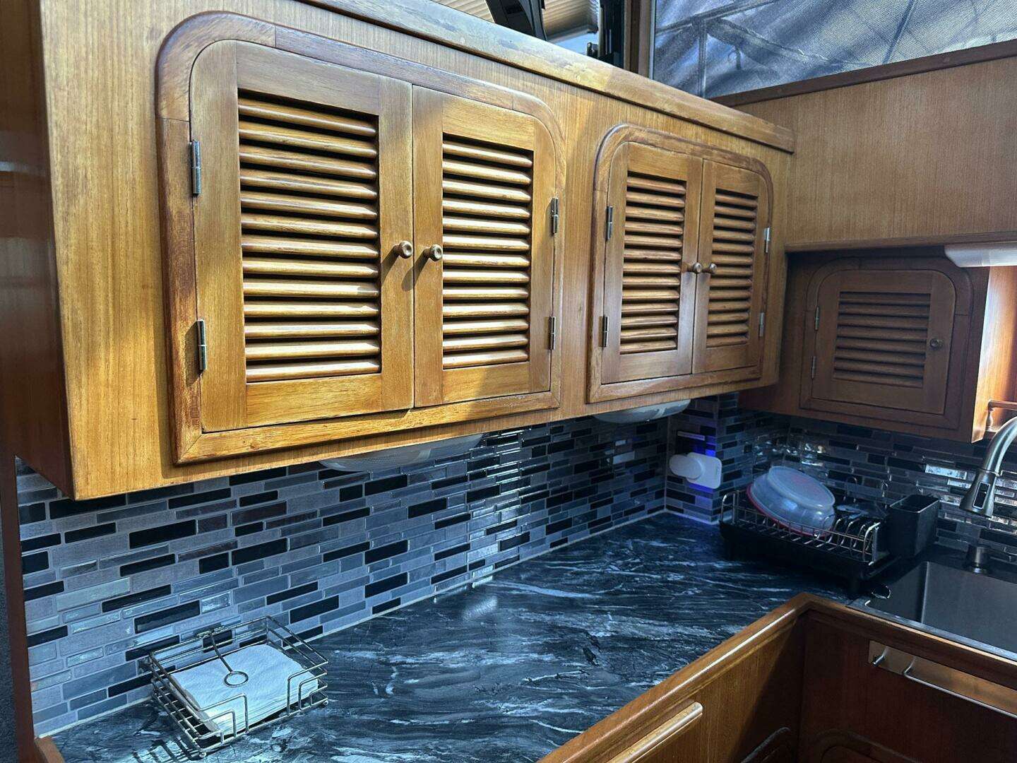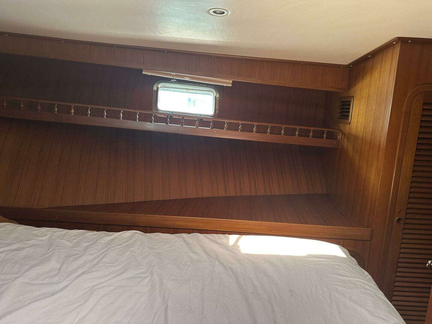 Entering OFF RAMP from the starboard salon door you notice the lower helm station with a full array of navigation equipment and gauges. The salon interior is highlighted by solid Teak cabinetry and paneling creating a warm and traditional atmosphere. The salon is bright and airy with large windows providing natural light.