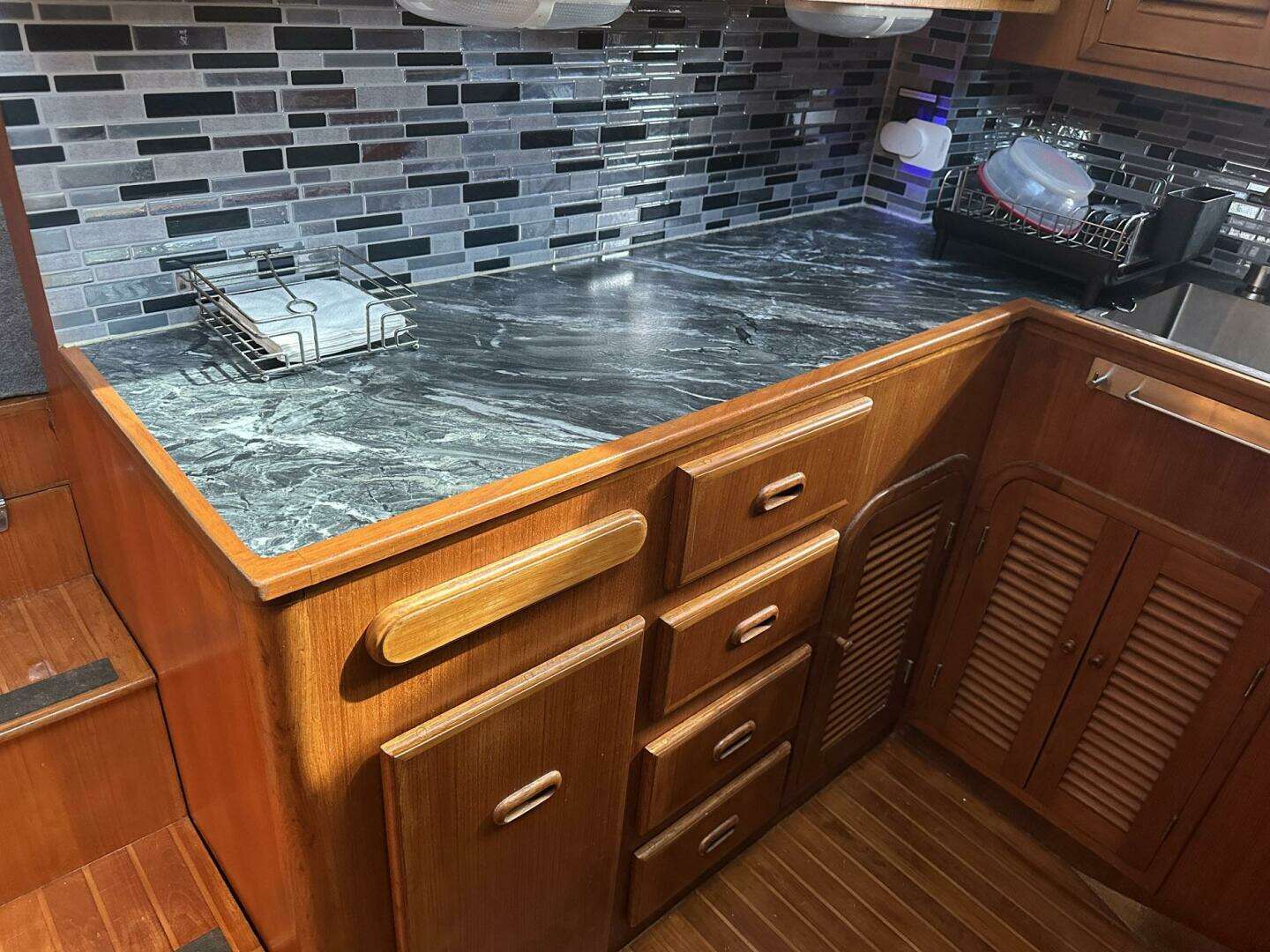 The well equipped galley is designed for extended cruising refurbished in 2023. Includes excellent storage, refrigerator/freezer, electric cooktop, large stainless steel sink, and toaster oven.