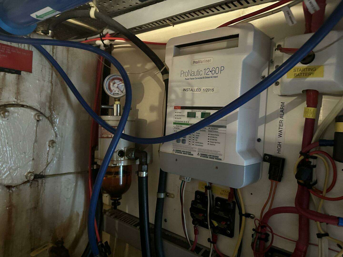 - ProMariner 60 amp charger for start battery. Also wired to charge house bank as backup.