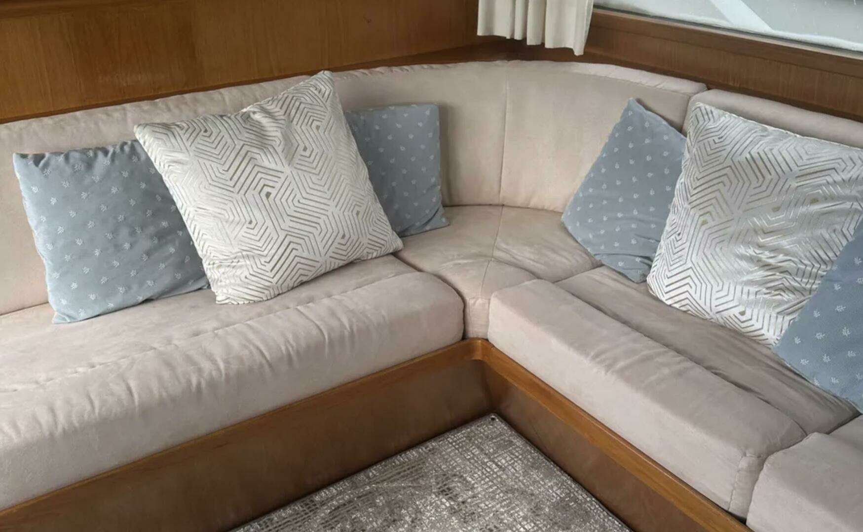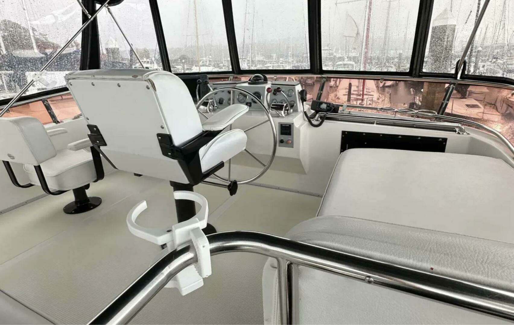 Entering the aft deck and you will notice very nicely painted decks, with plenty of non skip texture. Going up the ladder onto a very large open deck perfect for entertaining. Climbing the 5 steps up on to the fully enclosed fly bridge with new front isinglass windows adds another room and dimension to the boat.