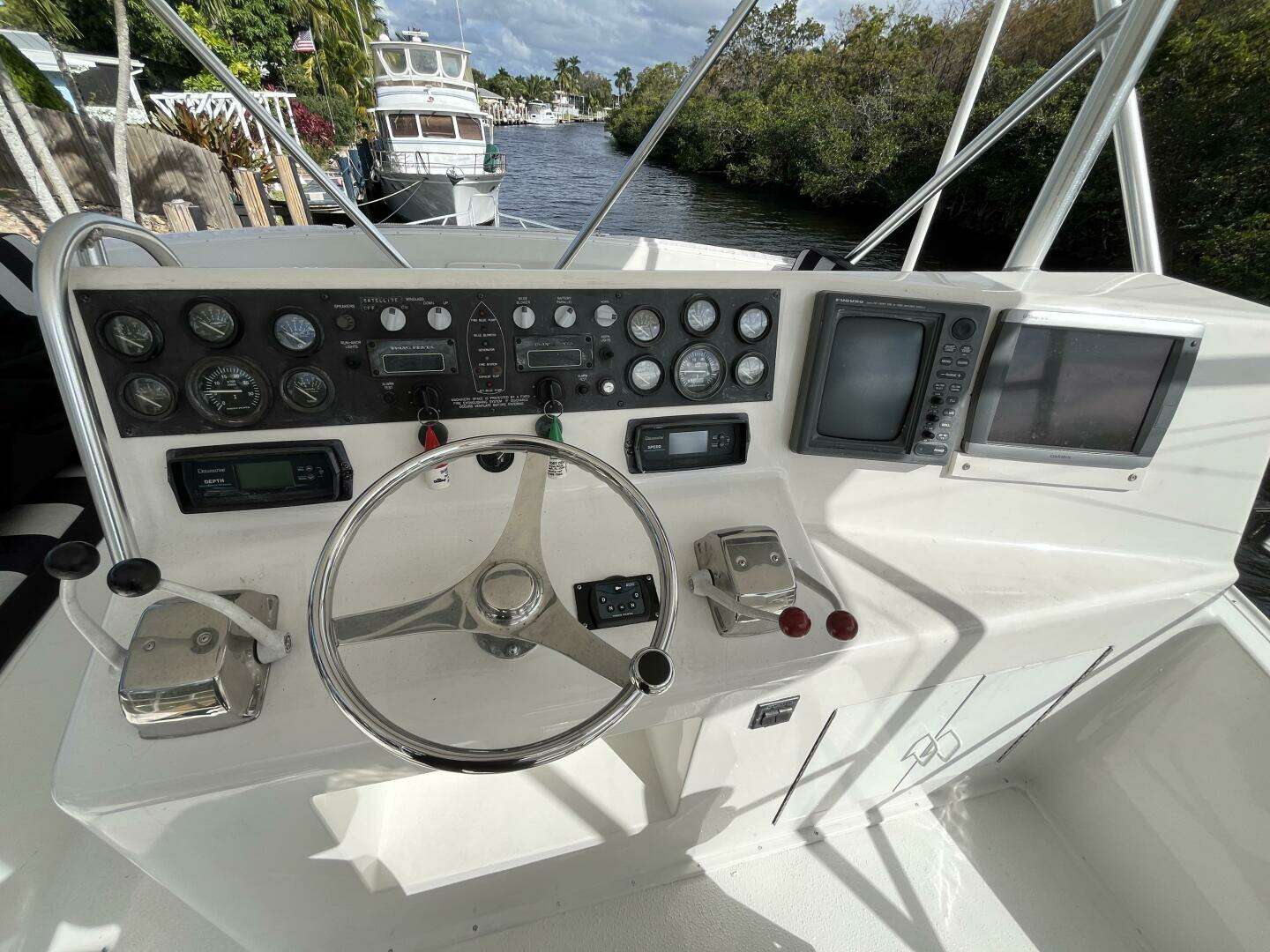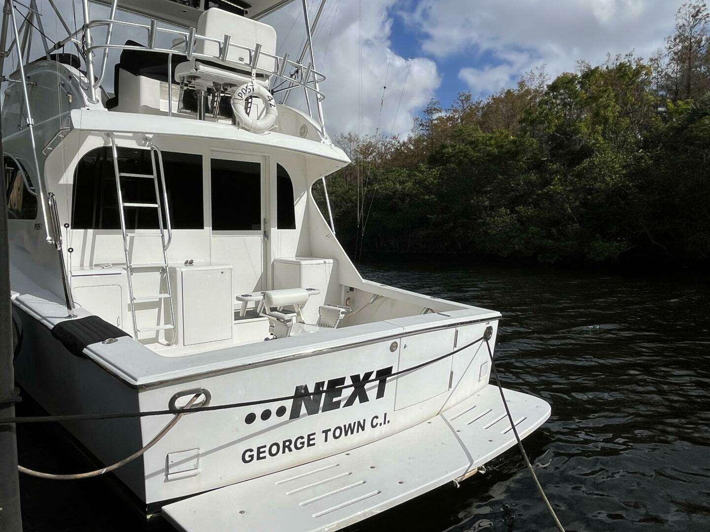 - Cockpit: Fighting chair, rocket launcher, oversized bait well, transom door, engine room access from cockpit, ample drawers/storage